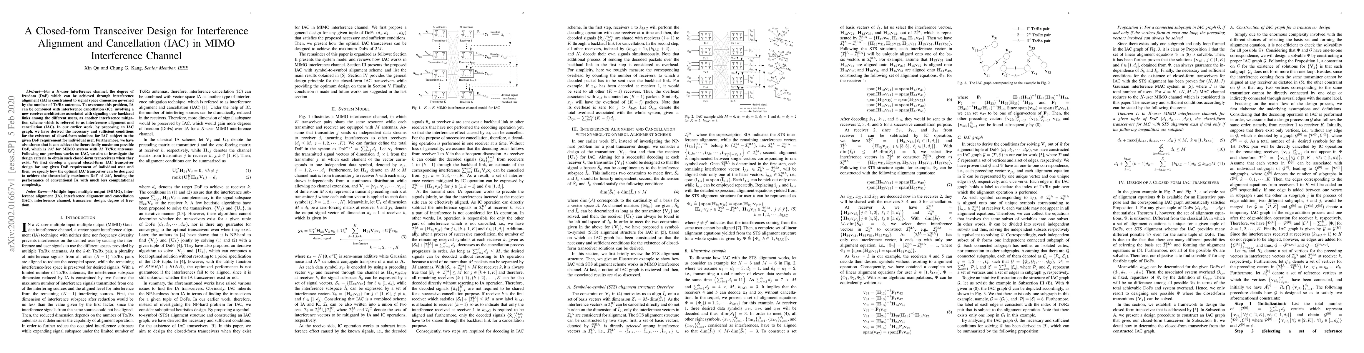 This paper proposes a closed-form transceiver design for interference alignment and cancellation (IAC) in MIMO systems, achieving the maximum possible degree of freedom (DoF) of 2M for M Tx/Rx antennas. It offers a general design for any DoF requirement and specifies optimal IAC transceiver configurations for maximum DoF, outperforming conventional interference alignment with lower computational complexity.