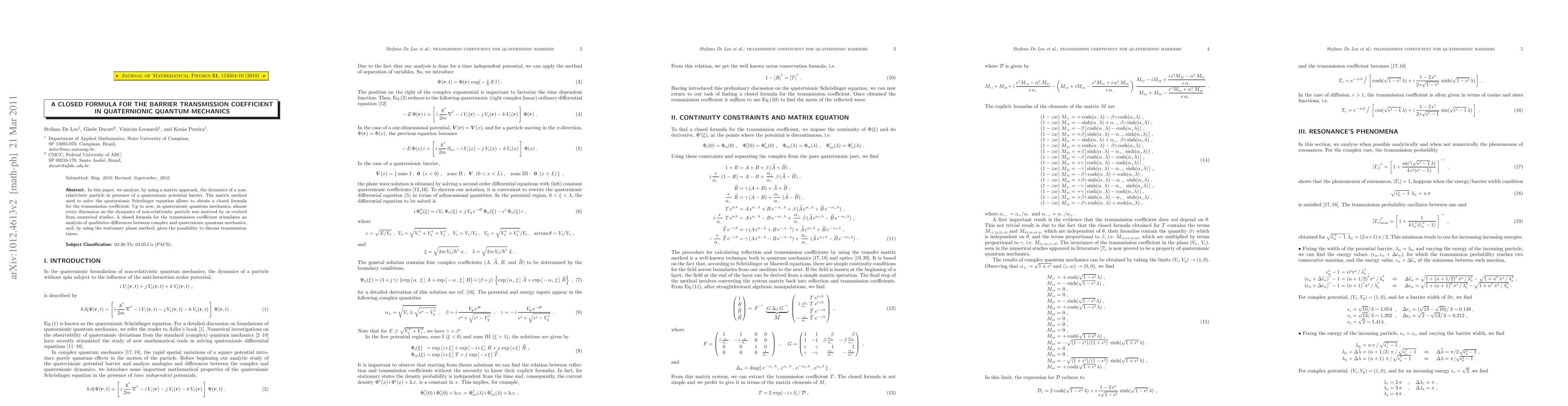 This paper derives a closed formula for the barrier transmission coefficient in quaternionic quantum mechanics via a matrix approach to solve the quaternionic Schrödinger equation, providing a qualitative analysis comparing it to complex quantum mechanics and discussing transmission times.