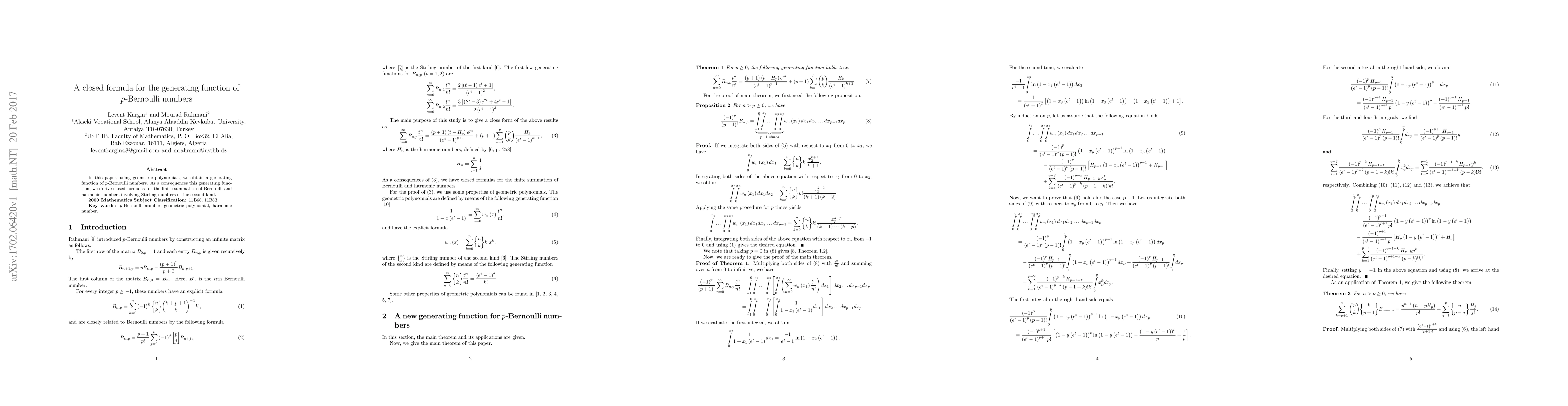 In this paper, using geometric polynomials, we obtain a generating function of p-Bernoulli numbers. As a consequences this generating function, we derive closed formulas for the finite summation of Bernoulli and harmonic numbers involving Stirling numbers of the second kind.