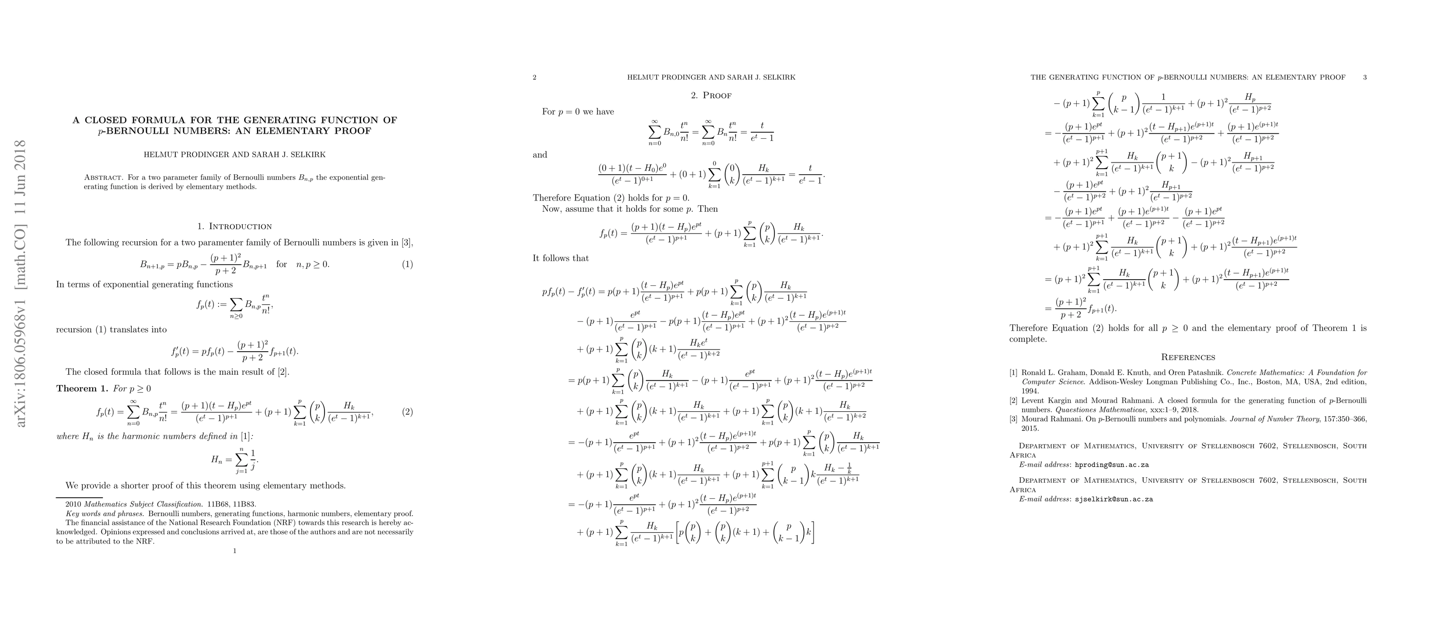 For a two parameter family of Bernoulli numbers $B_{n, p}$ the exponential generating function is derived by elementary methods.