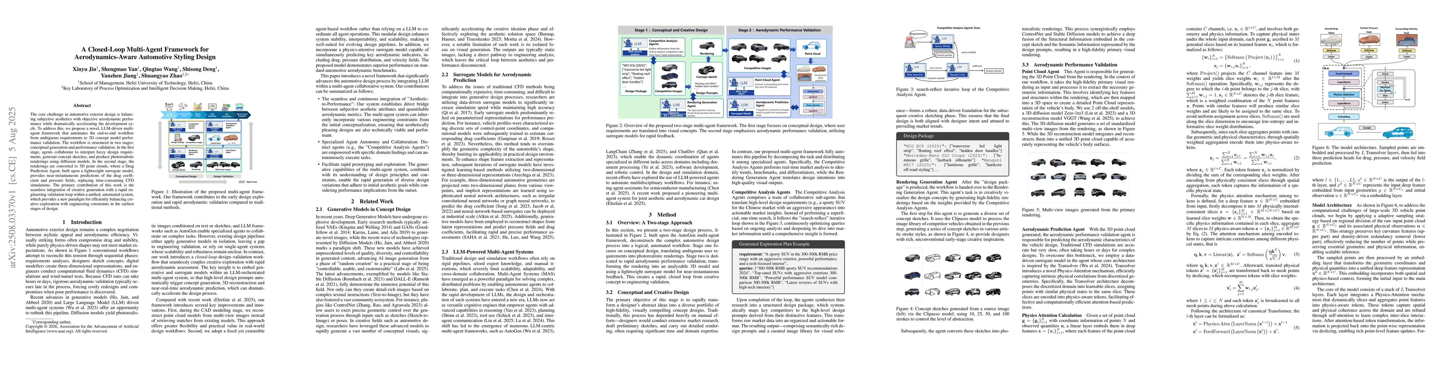 The core challenge in automotive exterior design is balancing subjective aesthetics with objective aerodynamic performance while dramatically accelerating the development cycle. To address this, we propose a novel, LLM-driven multi-agent framework that automates the end-to-end workflow from ambiguous requirements to 3D concept model performance validation. The workflow is structured in two stages: conceptual generation and performance validation. In the first stage, agents collaborate to interpret fuzzy design requirements, generate concept sketches, and produce photorealistic renderings using diffusion models. In the second stage, the renderings are converted to 3D point clouds, where a Drag Prediction Agent, built upon a lightweight surrogate model, provides near-instantaneous predictions of the drag coefficient and pressure fields, replacing time-consuming CFD simulations. The primary contribution of this work is the seamless integration of creative generation with a rapid engineering validation loop within a unified, automated system, which provides a new paradigm for efficiently balancing creative exploration with engineering constraints in the earliest stages of design.