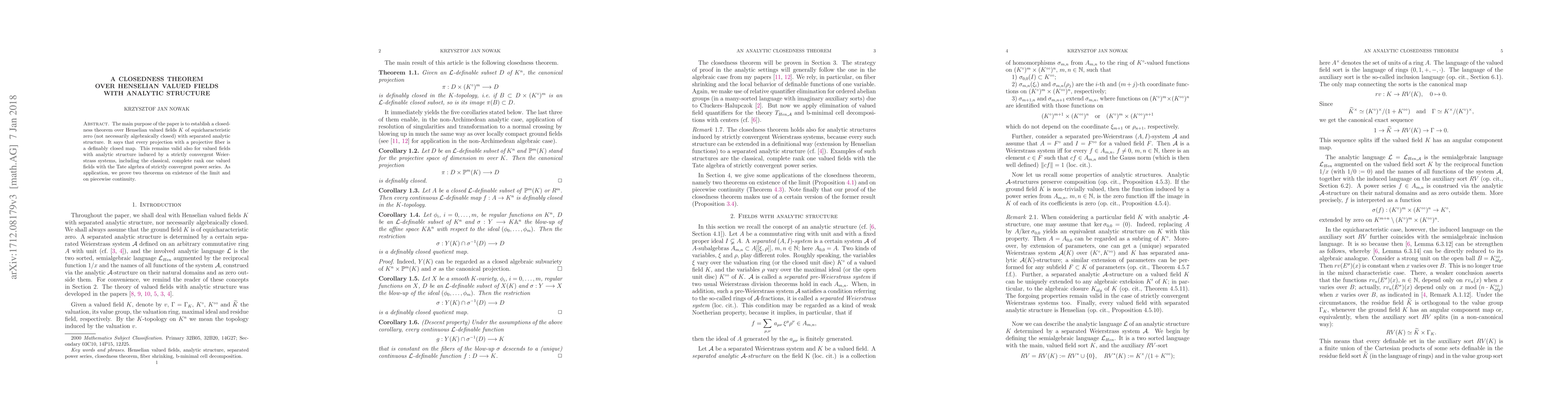 The main purpose of the paper is to establish a closedness theorem over Henselian valued fields $K$ of equicharacteristic zero (not necessarily algebraically closed) with separated analytic structure. It says that every projection with a projective fiber is a definably closed map. This remains valid also for valued fields with analytic structure induced by a strictly convergent Weierstrass systems, including the classical, complete rank one valued fields with the Tate algebra of strictly convergent power series. As application, we prove two theorems on existence of the limit and on piecewise continuity.