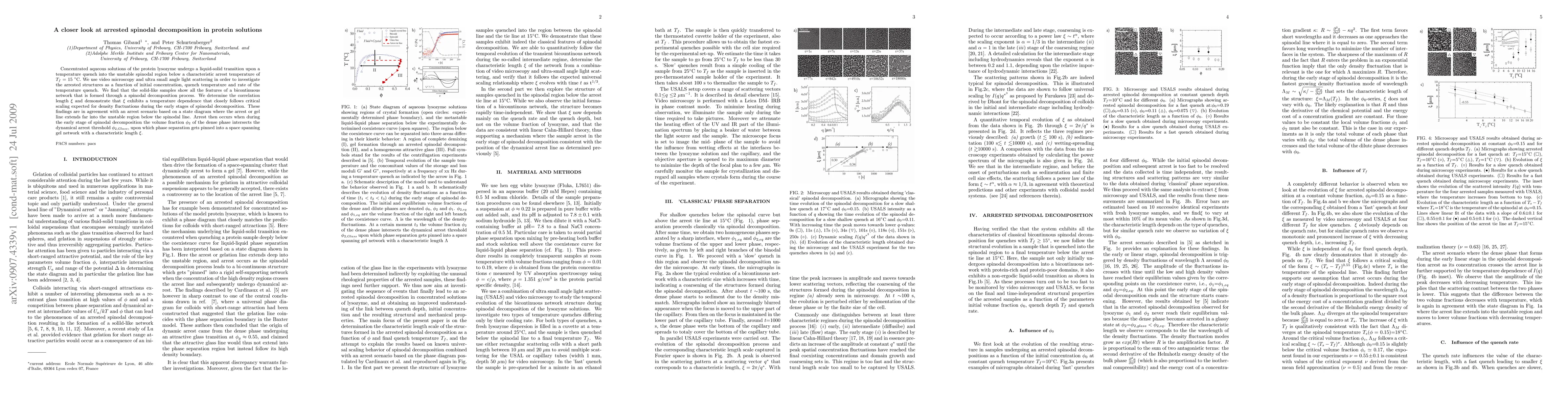 This study investigates the arrested spinodal decomposition in lysozyme protein solutions, revealing a bicontinuous network formed below a critical arrest temperature. The correlation length follows critical scaling, indicating arrested phase separation pinned into a gel network when the dense phase fraction intersects a critical threshold.