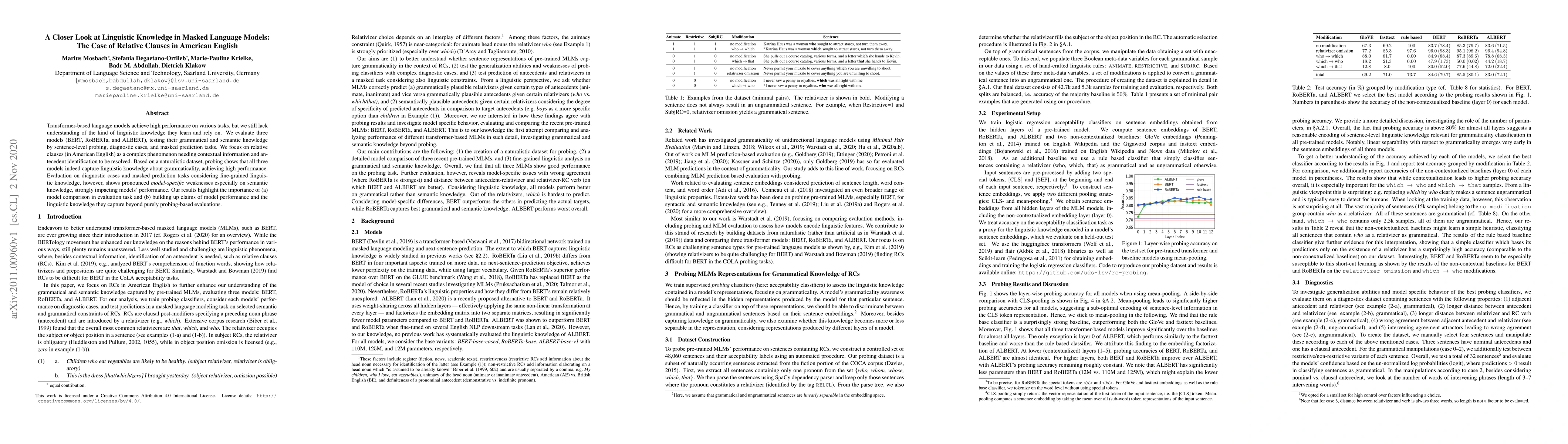 Transformer-based language models achieve high performance on various tasks, but we still lack understanding of the kind of linguistic knowledge they learn and rely on. We evaluate three models (BERT, RoBERTa, and ALBERT), testing their grammatical and semantic knowledge by sentence-level probing, diagnostic cases, and masked prediction tasks. We focus on relative clauses (in American English) as a complex phenomenon needing contextual information and antecedent identification to be resolved. Based on a naturalistic dataset, probing shows that all three models indeed capture linguistic knowledge about grammaticality, achieving high performance. Evaluation on diagnostic cases and masked prediction tasks considering fine-grained linguistic knowledge, however, shows pronounced model-specific weaknesses especially on semantic knowledge, strongly impacting models' performance. Our results highlight the importance of (a)model comparison in evaluation task and (b) building up claims of model performance and the linguistic knowledge they capture beyond purely probing-based evaluations.