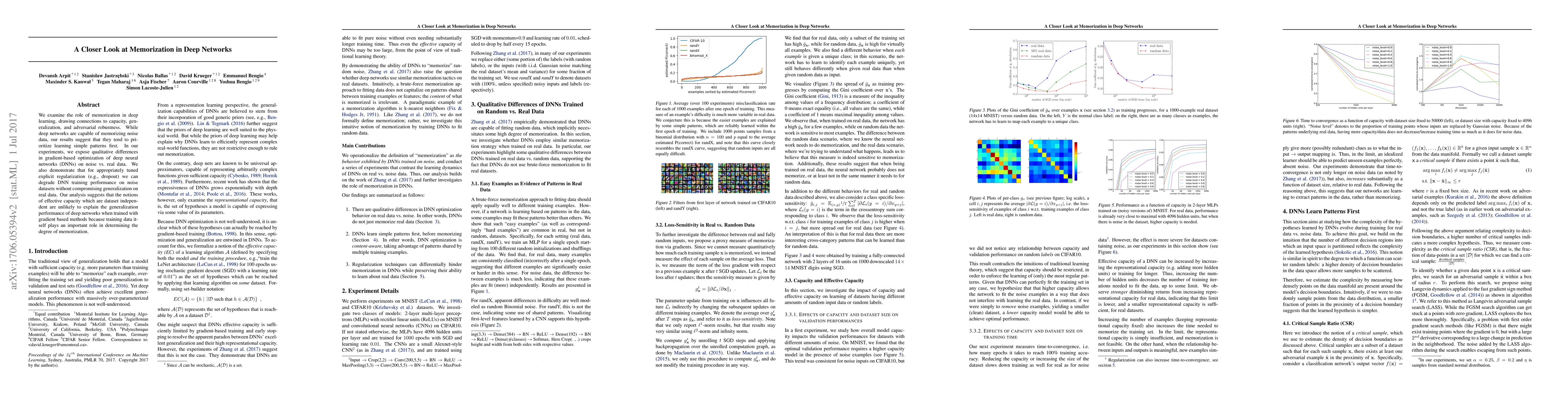 This paper investigates how deep networks memorize data, finding they prioritize learning simple patterns over noise. It shows that gradient-based optimization behaves differently on noise versus real data, and that explicit regularization can degrade performance on noise without affecting generalization on real data, suggesting training data significantly influences memorization.