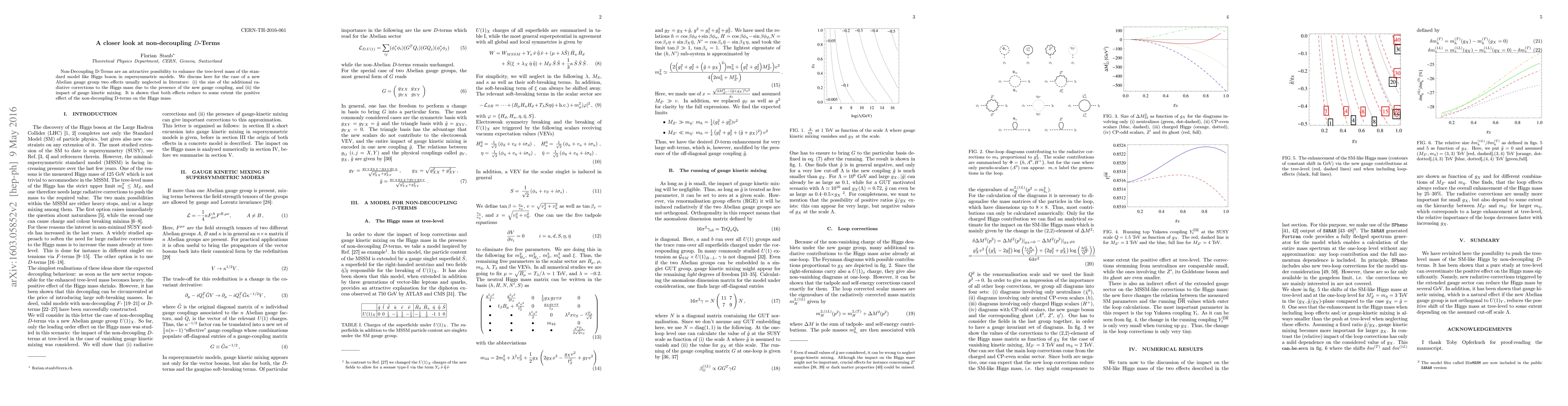 This paper examines non-decoupling D-Terms in supersymmetric models, focusing on a new Abelian gauge group. It highlights two often overlooked effects: additional radiative corrections from the new gauge coupling and the impact of gauge kinetic mixing, both of which partially mitigate the positive effect of D-Terms on the Higgs mass.