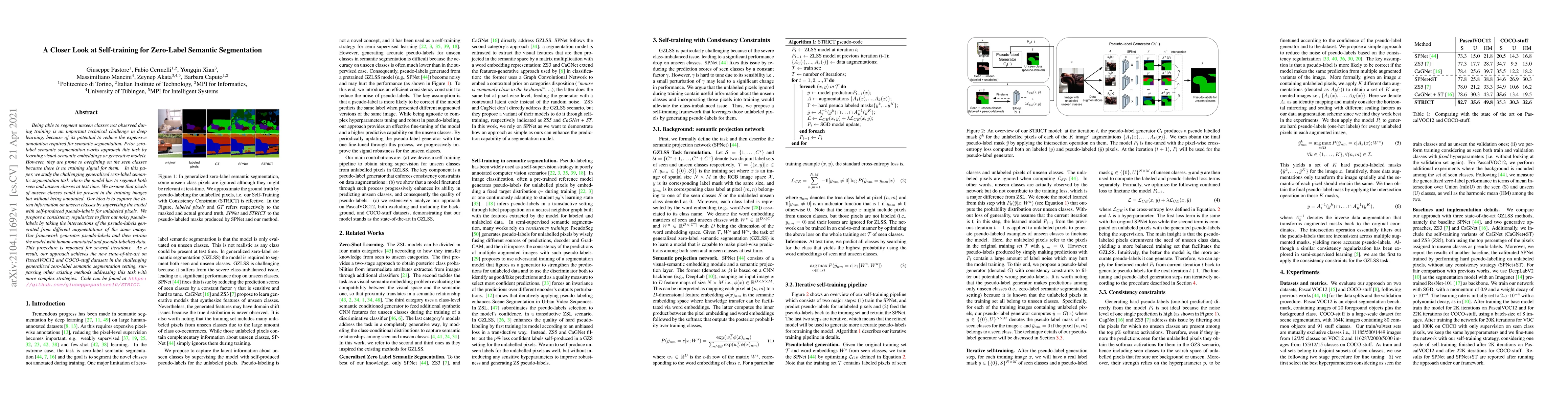 This paper proposes a self-training method for zero-label semantic segmentation that generates pseudo-labels for unlabeled pixels to segment both seen and unseen classes. It employs a consistency regularizer to filter out noisy pseudo-labels, achieving state-of-the-art results on PascalVOC12 and COCO-stuff datasets.