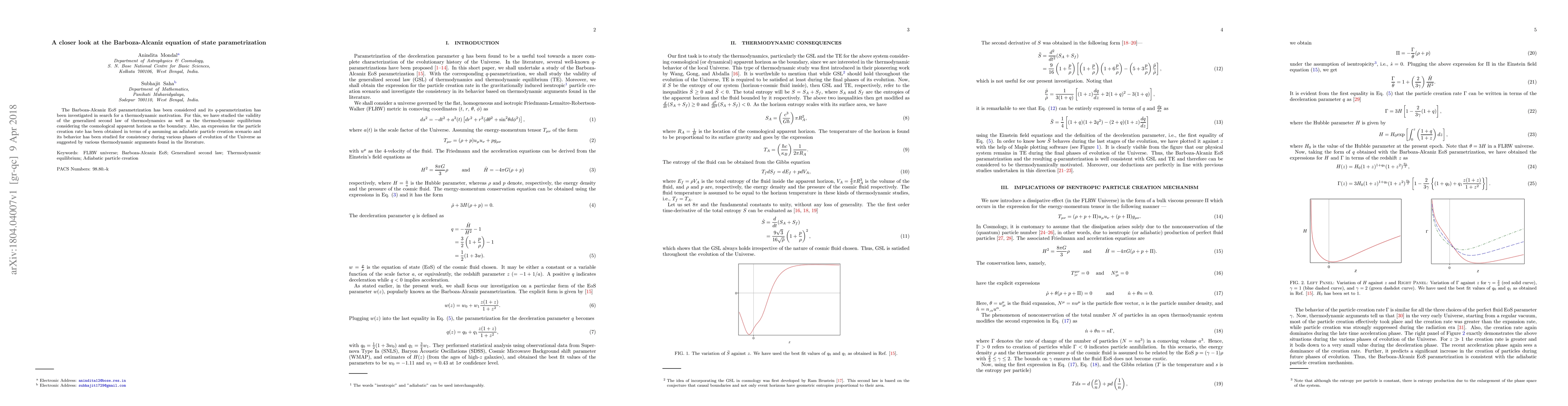 The Barboza-Alcaniz EoS parametrization has been considered and its $q$-parametrization has been investigated in search for a thermodynamic motivation. For this, we have studied the validity of the generalized second law of thermodynamics as well as the thermodynamic equilibrium considering the cosmological apparent horizon as the boundary. Also, an expression for the particle creation rate has been obtained in terms of $q$ assuming an adiabatic particle creation scenario and its behavior has been studied for consistency during various phases of evolution of the Universe as suggested by various thermodynamic arguments found in the literature.