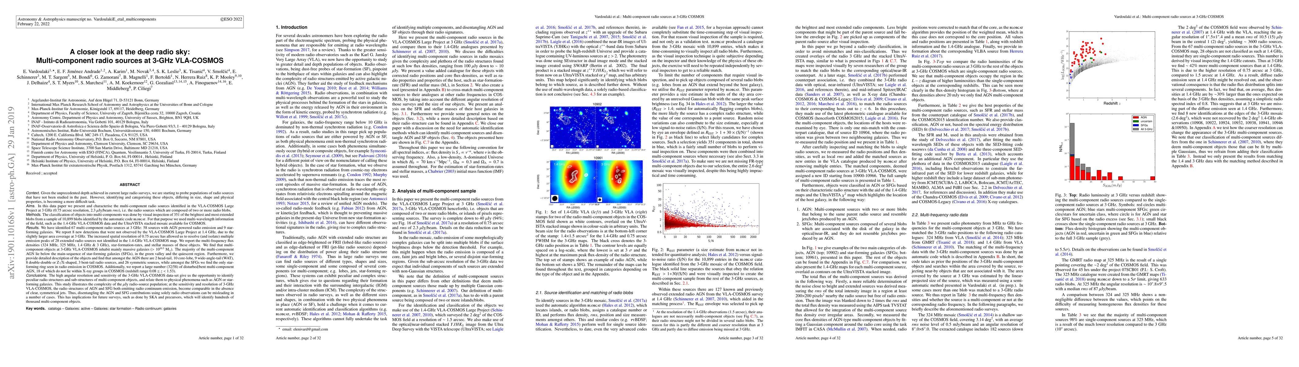 This paper characterizes multi-component radio sources identified in the VLA-COSMOS survey at 3 GHz, revealing 67 such sources, predominantly AGN-powered. The study highlights the increased resolution allowing the identification of multiple emission peaks in 28 extended sources not visible at 1.4 GHz, providing detailed multi-frequency flux data and stellar mass information.