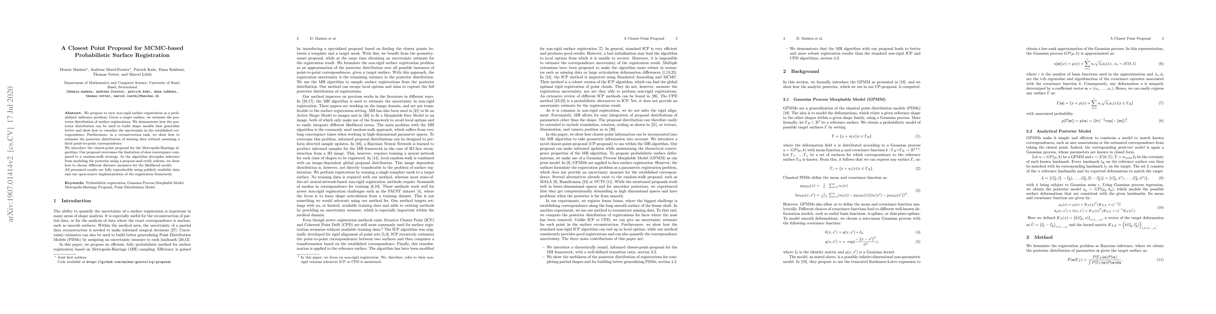 This paper proposes a probabilistic inference approach for non-rigid surface registration using MCMC, introducing a closest-point proposal for the Metropolis-Hastings algorithm, which improves convergence over random-walk strategies. The method estimates the posterior distribution for better shape modeling and uncertainty visualization, and is demonstrated with publicly available data.