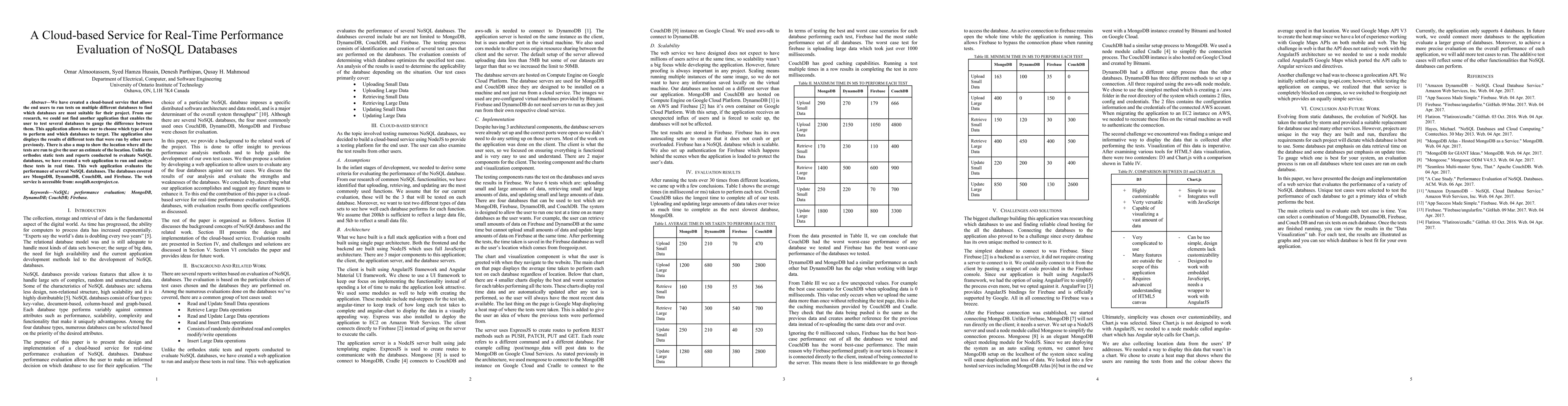 This paper presents a cloud-based service for real-time performance evaluation of NoSQL databases, allowing users to test multiple databases and compare their performance. The service provides a web application for dynamic testing and analysis, covering databases like MongoDB, DynamoDB, CouchDB, and Firebase.