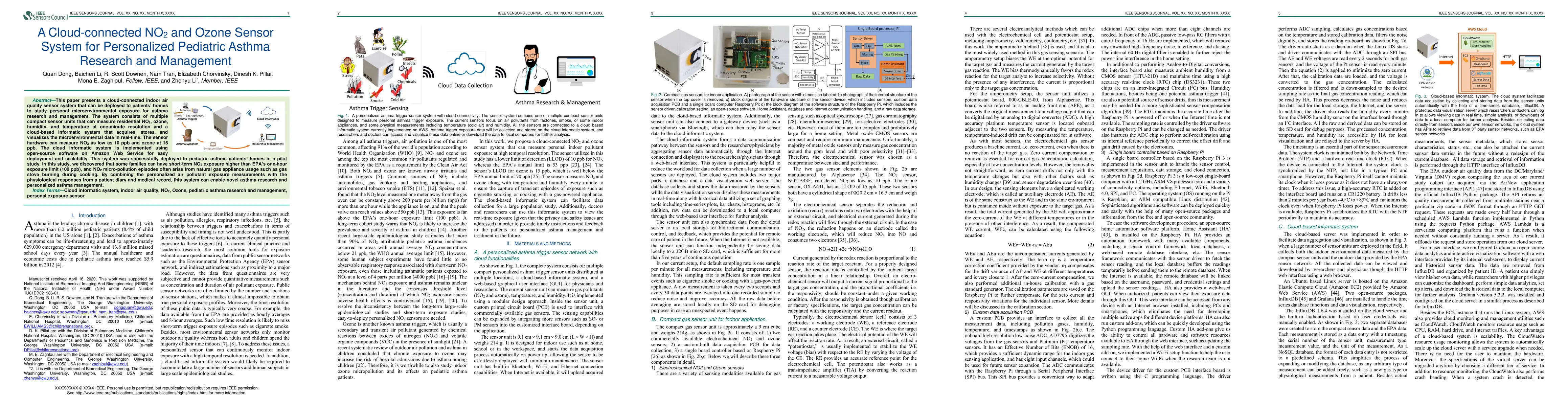 This paper introduces a cloud-connected sensor system for measuring indoor air quality, including NO2 and ozone, deployed in homes to study pediatric asthma. The system revealed short-term NO2 exposure exceeding EPA limits, often due to gas appliance usage, highlighting the potential for personalized asthma research and management.