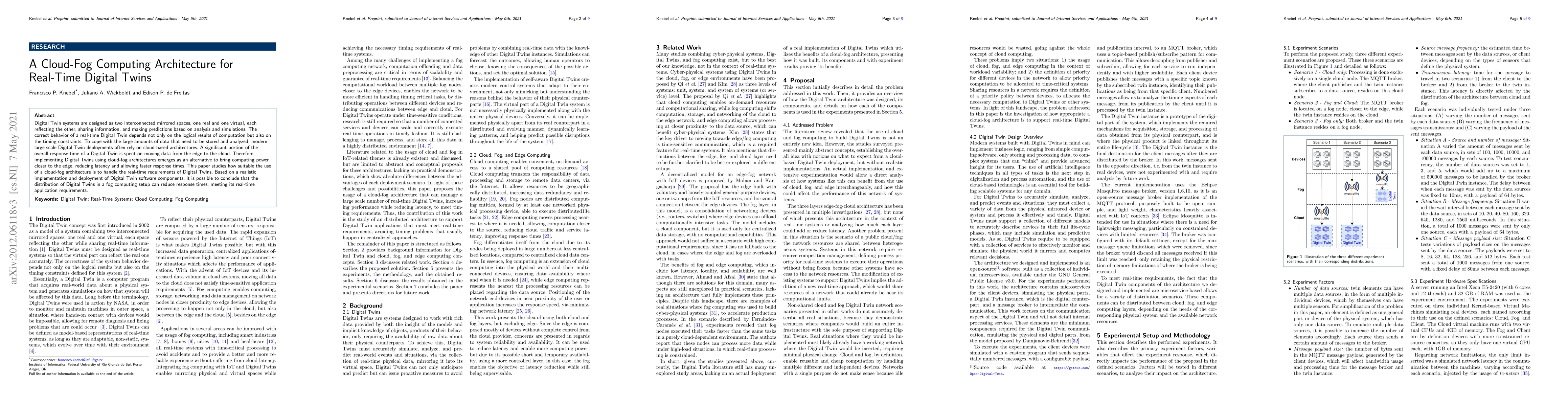 This paper explores the use of cloud-fog computing architectures to enhance real-time Digital Twin systems by reducing latency and improving response times through edge computing. The study concludes that deploying Digital Twins in fog computing setups can effectively meet the real-time requirements of such systems.