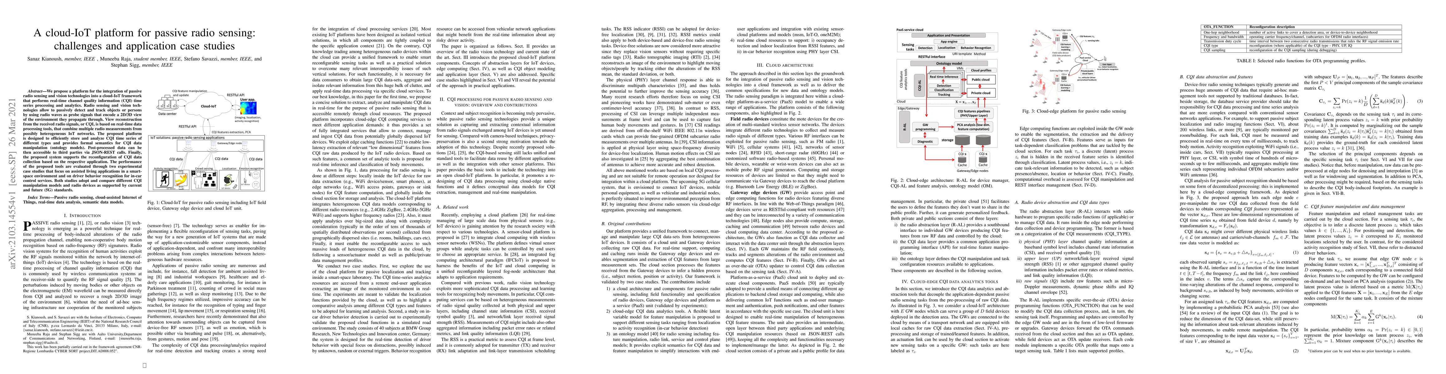 We propose a platform for the integration of passive radio sensing and vision technologies into a cloud-IoT framework that performs real-time channel quality information (CQI) time series processing and analytics. Radio sensing and vision technologies allow to passively detect and track objects or persons by using radio waves as probe signals that encode a 2D/3D view of the environment they propagate through. View reconstruction from the received radio signals, or CQI, is based on real-time data processing tools, that combine multiple radio measurements from possibly heterogeneous IoT networks. The proposed platform is designed to efficiently store and analyze CQI time series of different types and provides formal semantics for CQI data manipulation (ontology models). Post-processed data can be then accessible to third parties via JSON-REST calls. Finally, the proposed system supports the reconfiguration of CQI data collection based on the respective application. The performance of the proposed tools are evaluated through two experimental case studies that focus on assisted living applications in a smart-space environment and on driver behavior recognition for in-car control services. Both studies adopt and compare different CQI manipulation models and radio devices as supported by current and future (5G) standards.