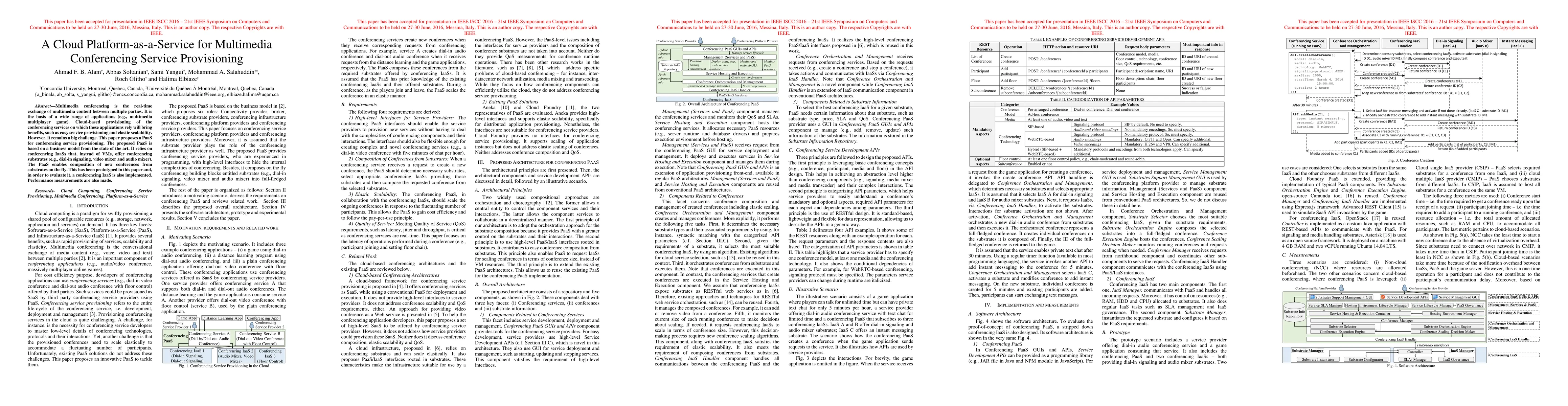 The paper presents a novel PaaS architecture for multimedia conferencing service provisioning, incorporating high-level interfaces, elastic scalability, and orchestration of conferencing substrates from IaaSs.