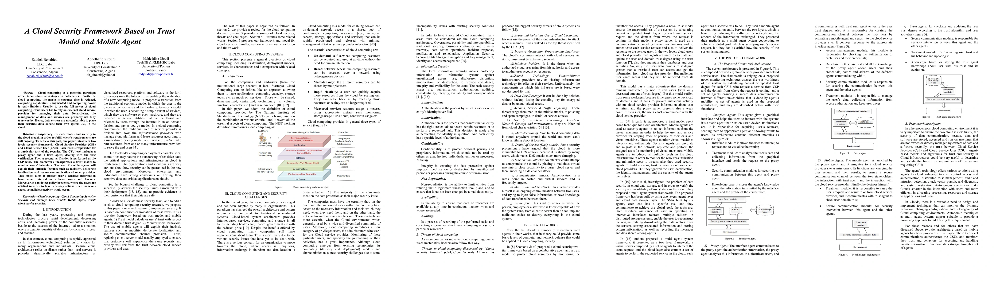 This paper proposes a two-level cloud security framework combining a trust model and mobile agents to enhance transparency, trustworthiness, and security for cloud service users. It aims to protect sensitive data by implementing verification at both the user and provider levels, with mobile agents ensuring secure communication and policy breach detection.