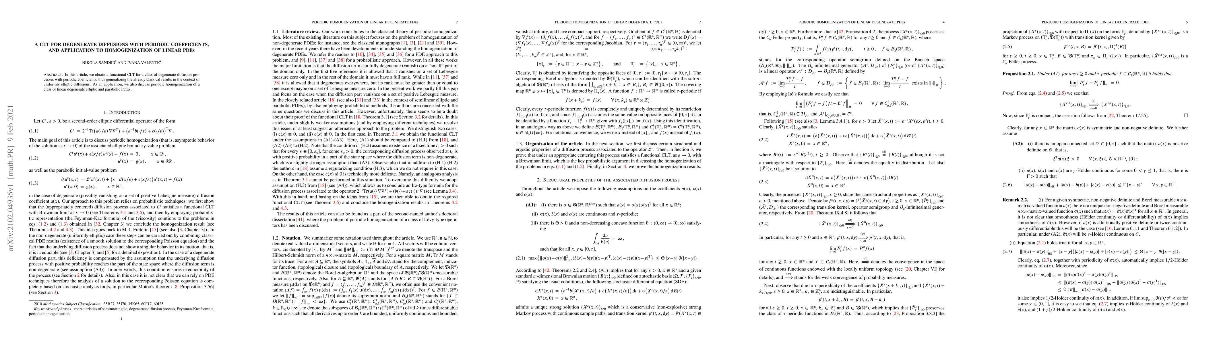 Summary: This paper establishes a functional central limit theorem for degenerate diffusion processes with periodic coefficients, extending classical results for uniformly elliptic diffusions. It also applies the theorem to the periodic homogenization of linear degenerate elliptic and parabolic PDEs.