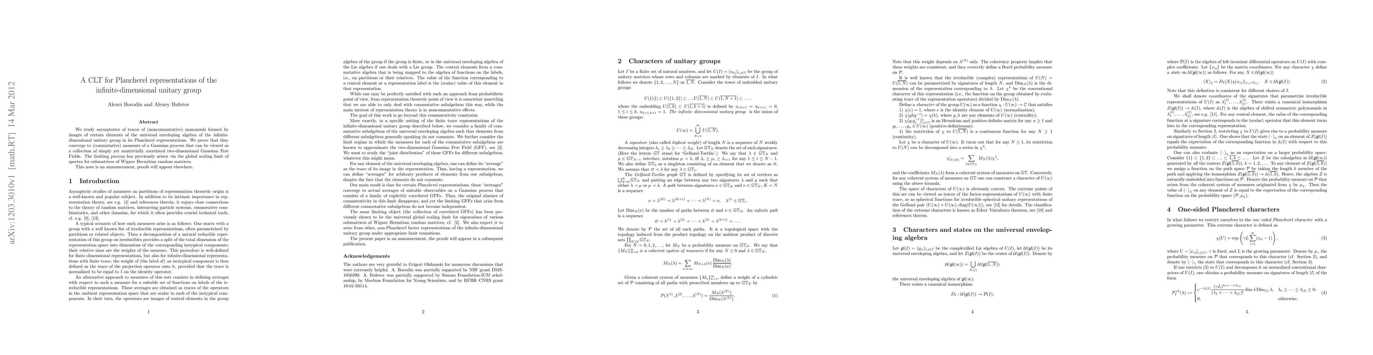 This paper announces the convergence of traces of monomials from the universal enveloping algebra of the infinite-dimensional unitary group in its Plancherel representations to moments of a Gaussian process. The limiting Gaussian process is a collection of two-dimensional Gaussian Free Fields, previously linked to the scaling limit of spectra in submatrices of Wigner Hermitian random matrices. Full proofs will be published separately.