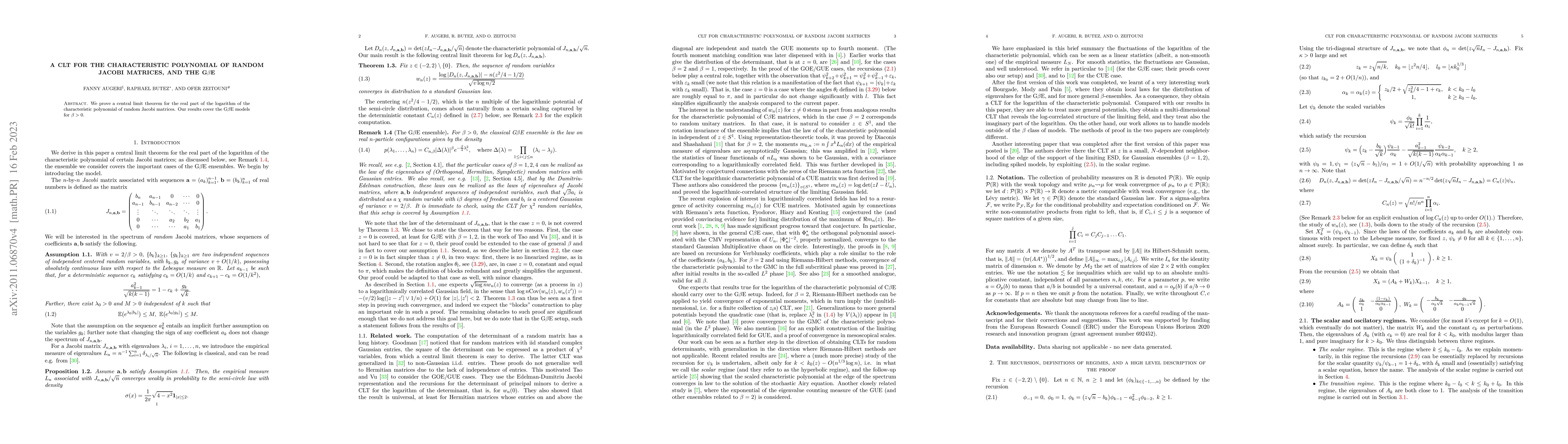 Summary: This paper establishes a central limit theorem for the logarithm of the characteristic polynomial of random Jacobi matrices, providing results for G$\beta$E models when $\beta > 0$. The findings contribute to understanding the statistical behavior of these matrices.