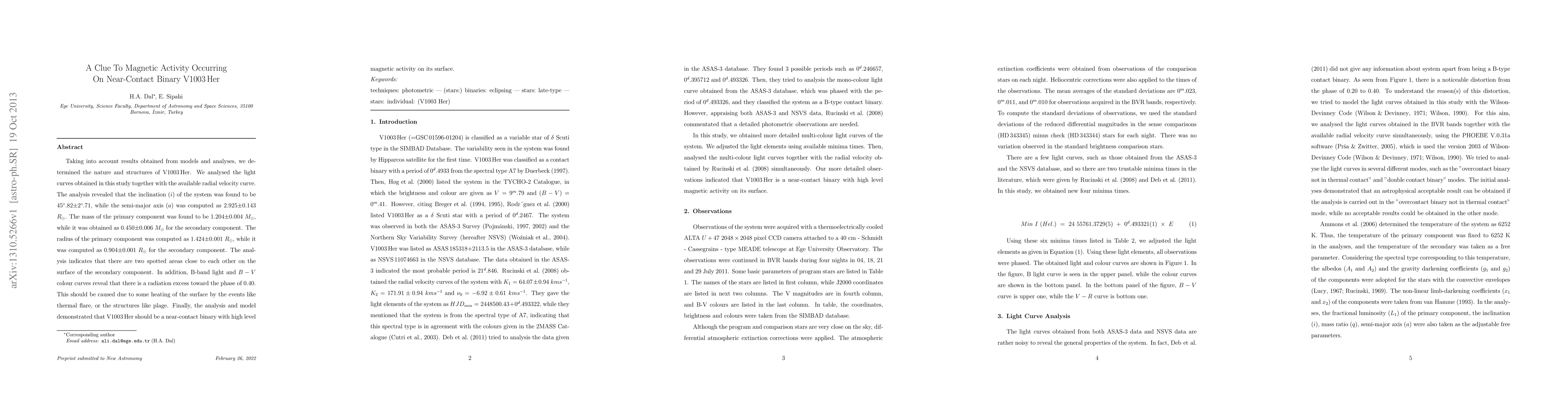 Taking into account results obtained from models and analyses, we determined the nature and structures of V1003 Her. We analysed the light curves obtained in this study together with the available radial velocity curve. The analysis revealed that the inclination (i) of the system was found to be 45.82 (2.71), while the semi-major axis (a) was computed as 2.925 (0.143) Rsun. The mass of the primary component was found to be 1.204 (0.004) Msun, while it was obtained as 0.450 (0.006) Msun for the secondary component. The radius of the primary component was computed as 1.424 (0.001) Rsun, while it was computed as 0.904 (0.001) Rsun for the secondary component. The analysis indicates that there are two spotted areas close to each other on the surface of the secondary component. In addition, B-band light and B-V colour curves reveal that there is a radiation excess toward the phase of 0.40. This should be caused due to some heating of the surface by the events like thermal flare, or the structures like plage. Finally, the analysis and model demonstrated that V1003 Her should be a near-contact binary with high level