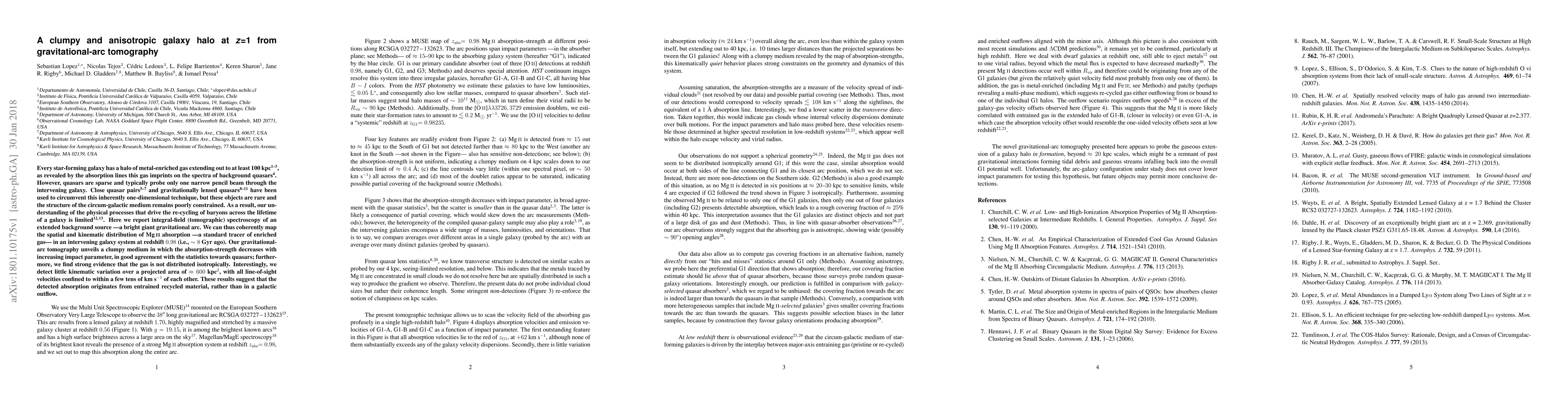 This study uses gravitational-arc tomography to map the spatial and kinematic distribution of an intervening galaxy's metal-enriched gas at redshift 0.98. The findings reveal a clumpy, anisotropic gas distribution with little kinematic variation, suggesting recycled material rather than an outflow.