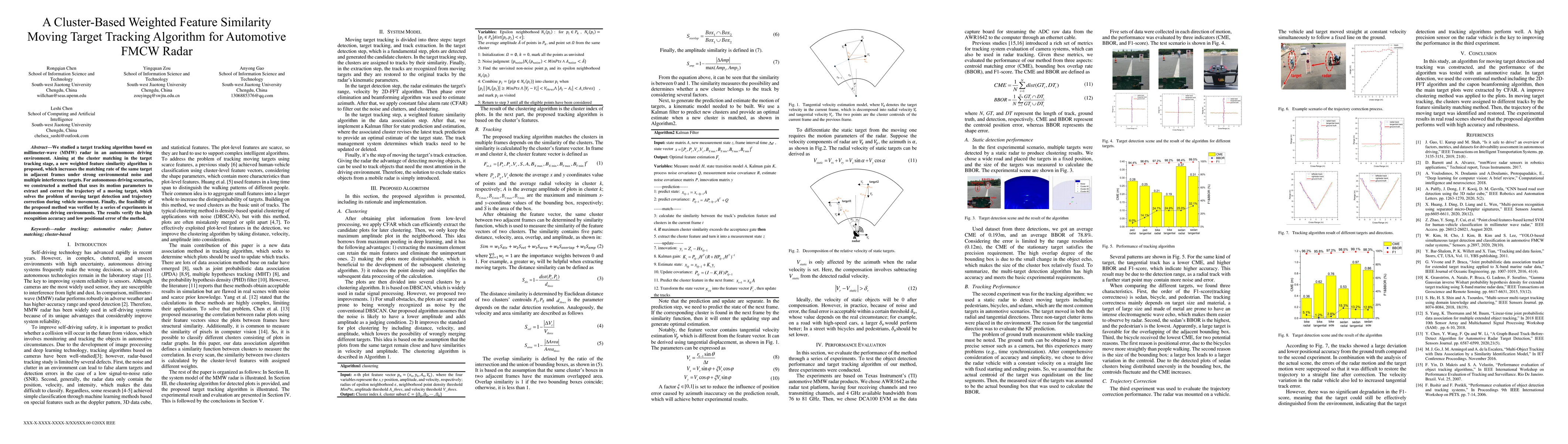 This paper proposes a cluster-based weighted feature similarity algorithm for tracking targets using millimeter-wave radar in autonomous driving. The method enhances target matching accuracy under noise and interference, and corrects moving target trajectories, validated by experiments showing high recognition accuracy and low positional error.