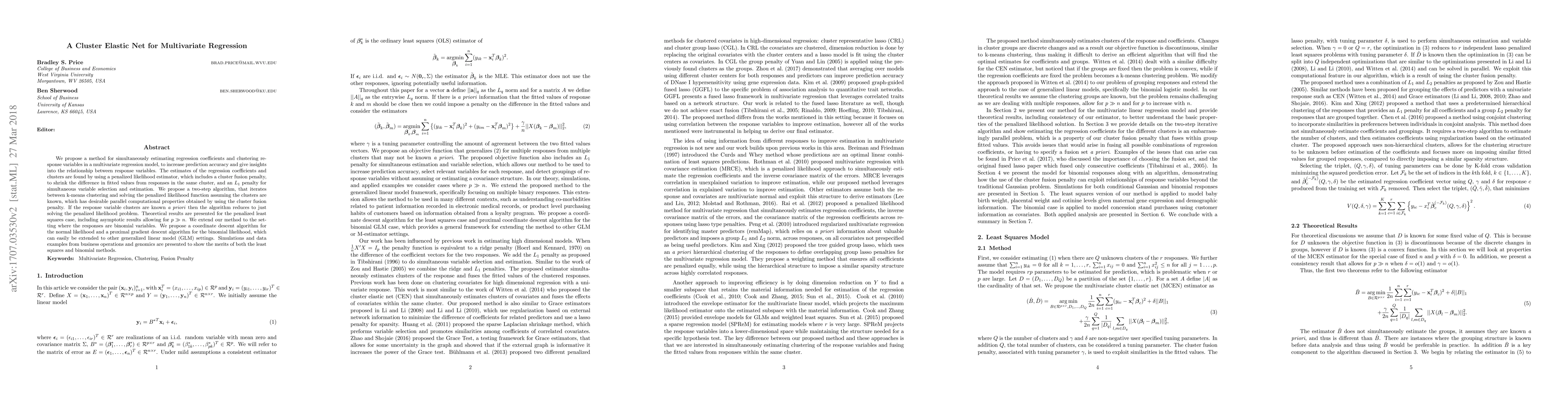 This paper introduces a Cluster Elastic Net method for multivariate regression that incorporates a fusion penalty to account for clustering in response variables and an L1 penalty for variable selection. It includes a coordinate descent algorithm for both normal and binomial likelihoods, and demonstrates its effectiveness through simulations and real-world data examples.