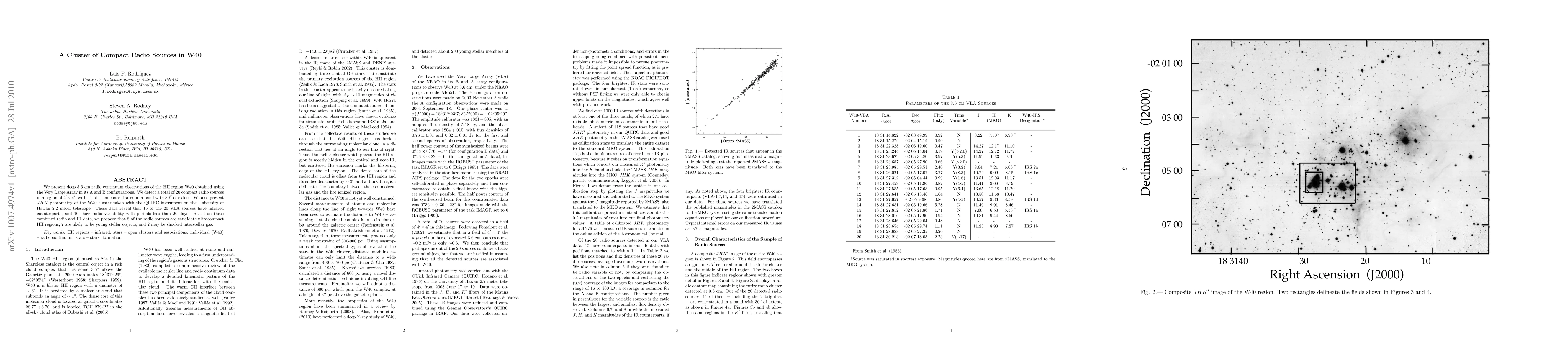 We present deep 3.6 cm radio continuum observations of the HII region W40 obtained using the Very Large Array in its A and B configurations. We detect a total of 20 compact radio sources in a region of 4 x 4 arcmin, with 11 of them concentrated in a band with 30 arcsec of extent. We also present JHK photometry of the W40 cluster taken with the QUIRC instrument on the University of Hawaii 2.2 meter telescope. These data reveal that 15 of the 20 VLA sources have infrared counterparts, and 10 show radio variability with periods less than 20 days. Based on these combined radio and IR data, we propose that 8 of the radio sources are candidate ultracompact HII regions, 7 are likely to be young stellar objects, and 2 may be shocked interstellar gas.