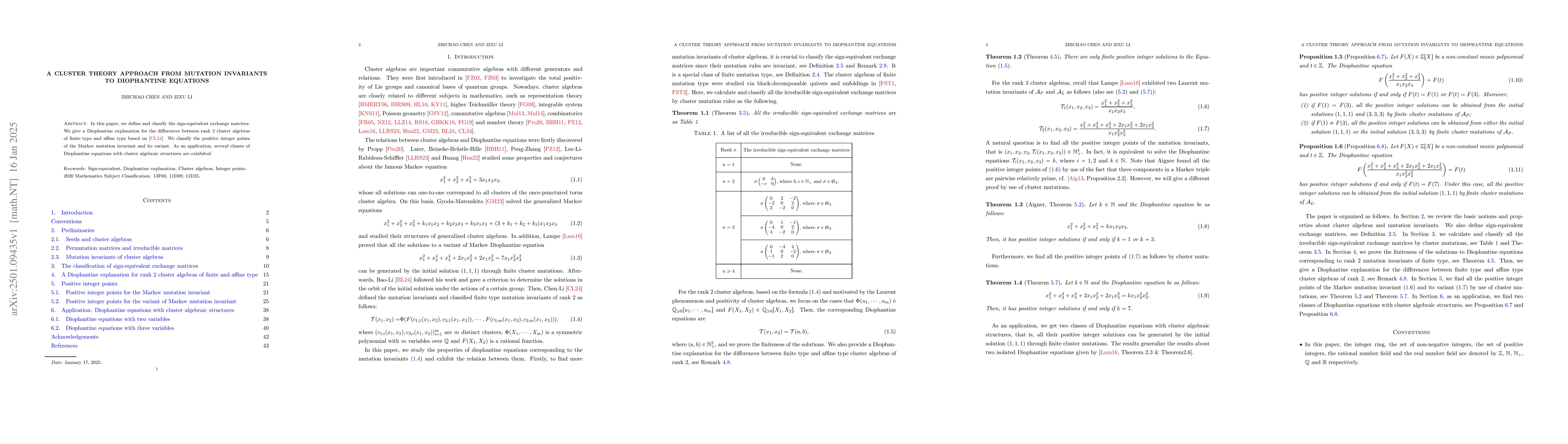 In this paper, we define and classify the sign-equivalent exchange matrices. We give a Diophantine explanation for the differences between rank 2 cluster algebras of finite type and affine type based on \cite{CL24}. We classify the positive integer points of the Markov mutation invariant and its variant. As an application, several classes of Diophantine equations with cluster algebraic structures are exhibited.
