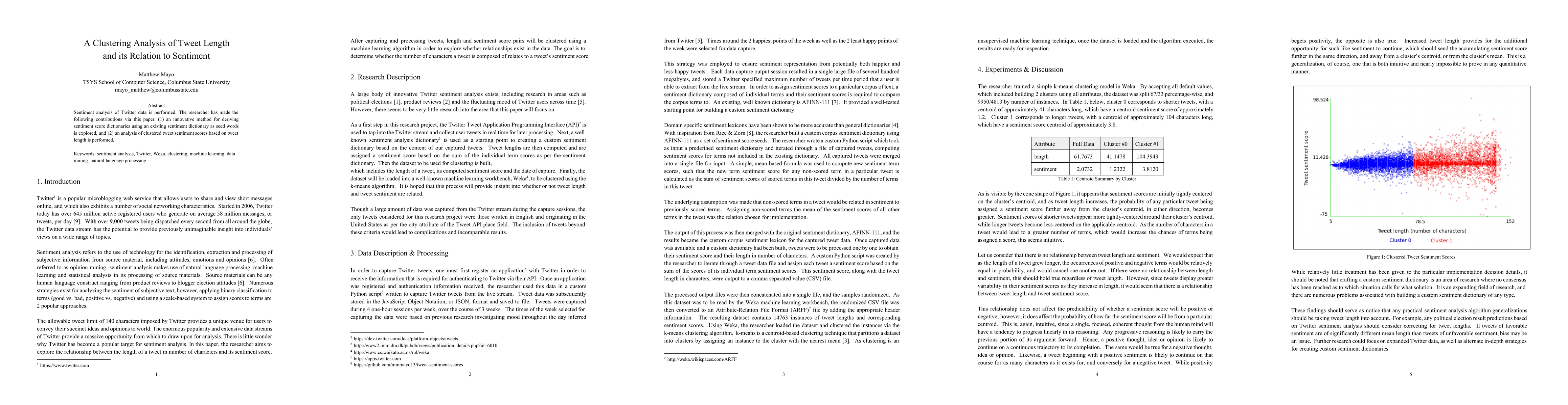Summary: This study introduces a novel method for expanding sentiment dictionaries and analyzes how tweet length correlates with sentiment by clustering tweet sentiment scores. The research reveals significant patterns in sentiment based on tweet length.