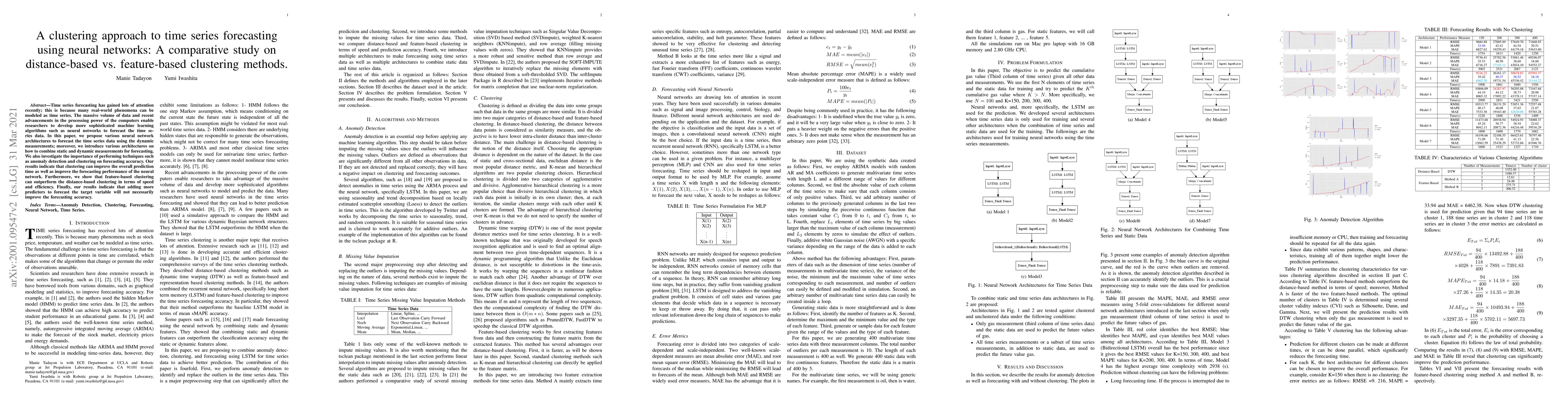 This paper explores neural network architectures for time series forecasting, comparing distance-based and feature-based clustering methods. Results show that feature-based clustering enhances both speed and efficiency over distance-based clustering, while adding more predictors does not necessarily improve forecasting accuracy.