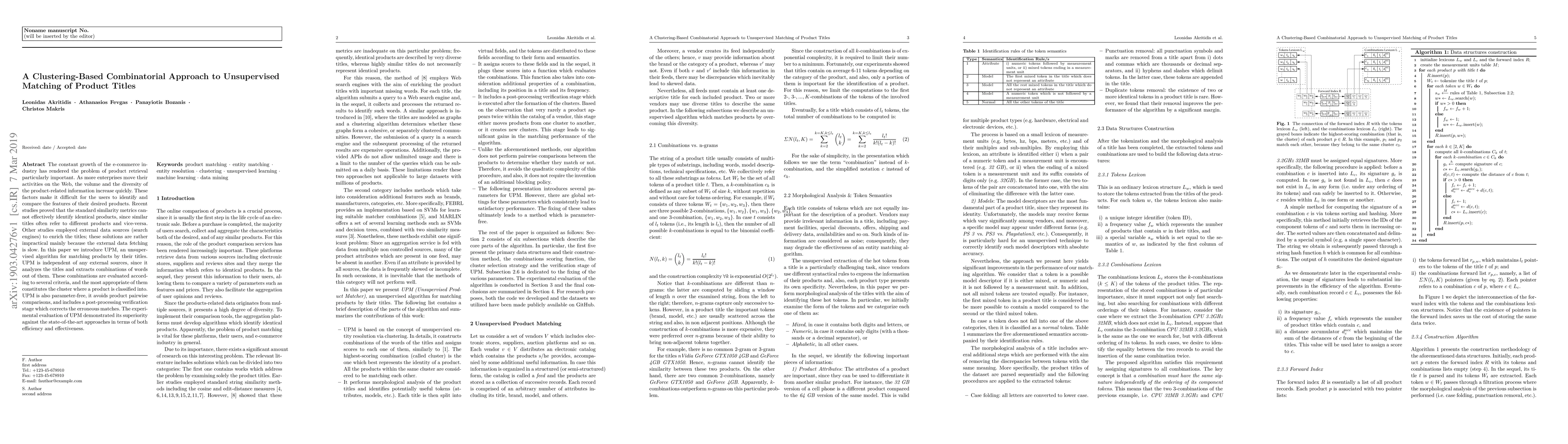The constant growth of the e-commerce industry has rendered the problem of product retrieval particularly important. As more enterprises move their activities on the Web, the volume and the diversity of the product-related information increase quickly. These factors make it difficult for the users to identify and compare the features of their desired products. Recent studies proved that the standard similarity metrics cannot effectively identify identical products, since similar titles often refer to different products and vice-versa. Other studies employed external data sources (search engines) to enrich the titles; these solutions are rather impractical mainly because the external data fetching is slow. In this paper we introduce UPM, an unsupervised algorithm for matching products by their titles. UPM is independent of any external sources, since it analyzes the titles and extracts combinations of words out of them. These combinations are evaluated according to several criteria, and the most appropriate of them constitutes the cluster where a product is classified into. UPM is also parameter-free, it avoids product pairwise comparisons, and includes a post-processing verification stage which corrects the erroneous matches. The experimental evaluation of UPM demonstrated its superiority against the state-of-the-art approaches in terms of both efficiency and effectiveness.