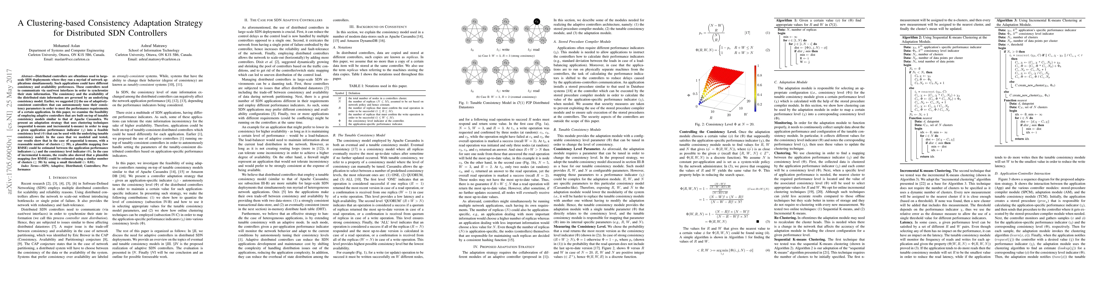 Distributed controllers are oftentimes used in large-scale SDN deployments where they run a myriad of network applications simultaneously. Such applications could have different consistency and availability preferences. These controllers need to communicate via east/west interfaces in order to synchronize their state information. The consistency and the availability of the distributed state information are governed by an underlying consistency model. Earlier, we suggested the use of adaptively-consistent controllers that can autonomously tune their consistency parameters in order to meet the performance requirements of a certain application. In this paper, we examine the feasibility of employing adaptive controllers that are built on-top of tunable consistency models similar to that of Apache Cassandra. We present an adaptation strategy that uses clustering techniques (sequential k-means and incremental k-means) in order to map a given application performance indicator into a feasible consistency level that can be used with the underlying tunable consistency model. In the cases that we modeled and tested, our results show that in the case of sequential k-means, with a reasonable number of clusters (>= 50), a plausible mapping (low RMSE) could be estimated between the application performance indicators and the consistency level indicator. In the case of incremental k-means, the results also showed that a plausible mapping (low RMSE) could be estimated using a similar number of clusters (>= 50) by using a small threshold (~$ 0.01).