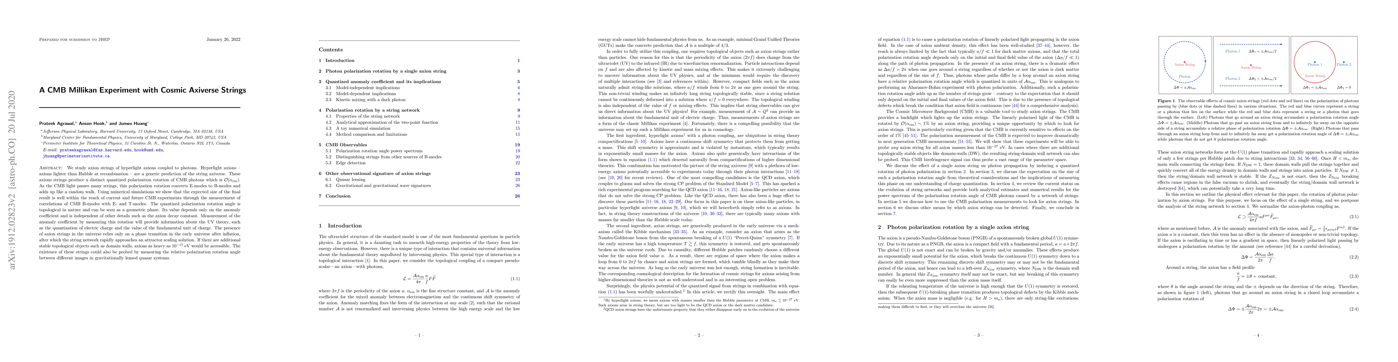 We study axion strings of hyperlight axions coupled to photons. Hyperlight axions -- axions lighter than Hubble at recombination -- are a generic prediction of the string axiverse. These axions strings produce a distinct quantized polarization rotation of CMB photons which is $\mathcal{O}(\alpha_{\rm em})$. As the CMB light passes many strings, this polarization rotation converts E-modes to B-modes and adds up like a random walk. Using numerical simulations we show that the expected size of the final result is well within the reach of current and future CMB experiments through the measurement of correlations of CMB B-modes with E- and T-modes. The quantized polarization rotation angle is topological in nature and can be seen as a geometric phase. Its value depends only on the anomaly coefficient and is independent of other details such as the axion decay constant. Measurement of the anomaly coefficient by measuring this rotation will provide information about the UV theory, such as the quantization of electric charge and the value of the fundamental unit of charge. The presence of axion strings in the universe relies only on a phase transition in the early universe after inflation, after which the string network rapidly approaches an attractor scaling solution. If there are additional stable topological objects such as domain walls, axions as heavy as $10^{-15}$ eV would be accessible. The existence of these strings could also be probed by measuring the relative polarization rotation angle between different images in gravitationally lensed quasar systems.