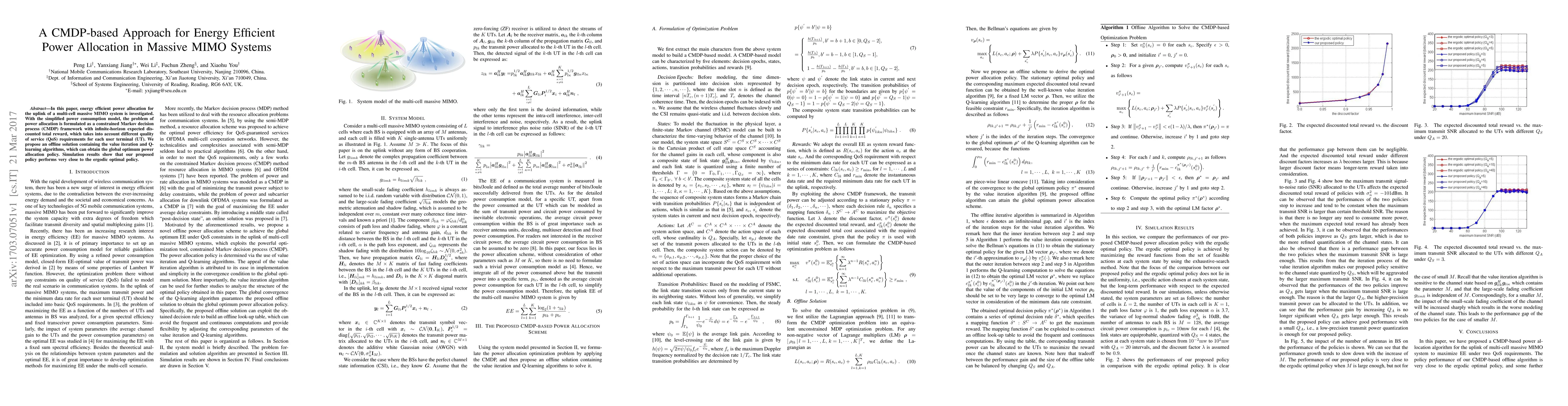 In this paper, energy efficient power allocation for the uplink of a multi-cell massive MIMO system is investigated. With the simplified power consumption model, the problem of power allocation is formulated as a constrained Markov decision process (CMDP) framework with infinite-horizon expected discounted total reward, which takes into account different quality of service (QoS) requirements for each user terminal (UT). We propose an offline solution containing the value iteration and Q-learning algorithms, which can obtain the global optimum power allocation policy. Simulation results show that our proposed policy performs very close to the ergodic optimal policy.