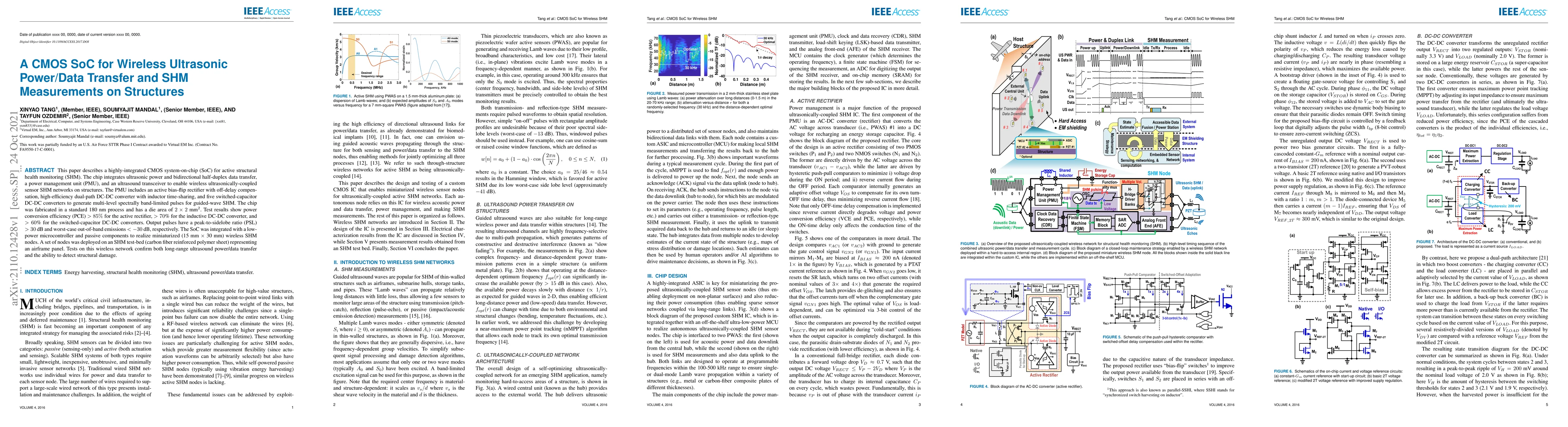 This paper describes a highly-integrated CMOS system-on-chip (SoC) for active structural health monitoring (SHM). The chip integrates ultrasonic power and bidirectional half-duplex data transfer, a power management unit (PMU), and an ultrasound transceiver to enable wireless ultrasonically-coupled sensor SHM networks on structures. The PMU includes an active bias-flip rectifier with off-delay compensation, high-efficiency dual-path DC-DC converter with inductor time-sharing, and five switched-capacitor DC-DC converters to generate multi-level spectrally band-limited pulses for guided-wave SHM. The chip was fabricated in a standard 180 nm process and has a die area of $2\times 2$ mm$^{2}$. Test results show power conversion efficiency (PCE) $>85\%$ for the active rectifier, $>70$\% for the inductive DC-DC converter, and $>60$\% for the switched-capacitor DC-DC converters. Output pulses have a peak-to-sidelobe ratio (PSL) $>30$~dB and worst-case out-of-band emissions $<-30$~dB, respectively. The SoC was integrated with a low-power microcontroller and passive components to realize miniaturized (15~mm $\times$ 30~mm) wireless SHM nodes. A set of nodes was deployed on an SHM test-bed (carbon fiber reinforced polymer sheet) representing an airframe panel. Tests on this wireless network confirm both long-range ultrasound power/data transfer and the ability to detect structural damage.