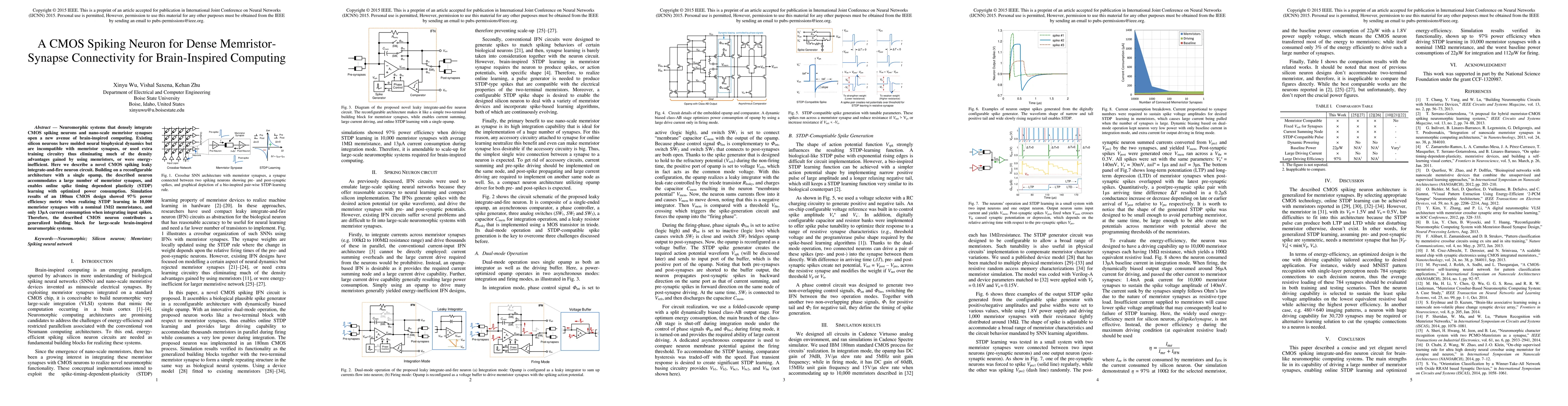 This paper presents a novel CMOS spiking neuron circuit designed for dense memristor-synapse integration in neuromorphic systems, achieving high-density connectivity and optimized power consumption for brain-inspired computing. The proposed leaky integrate-and-fire neuron supports online spike timing dependent plasticity learning with 97% power efficiency and minimal current consumption.