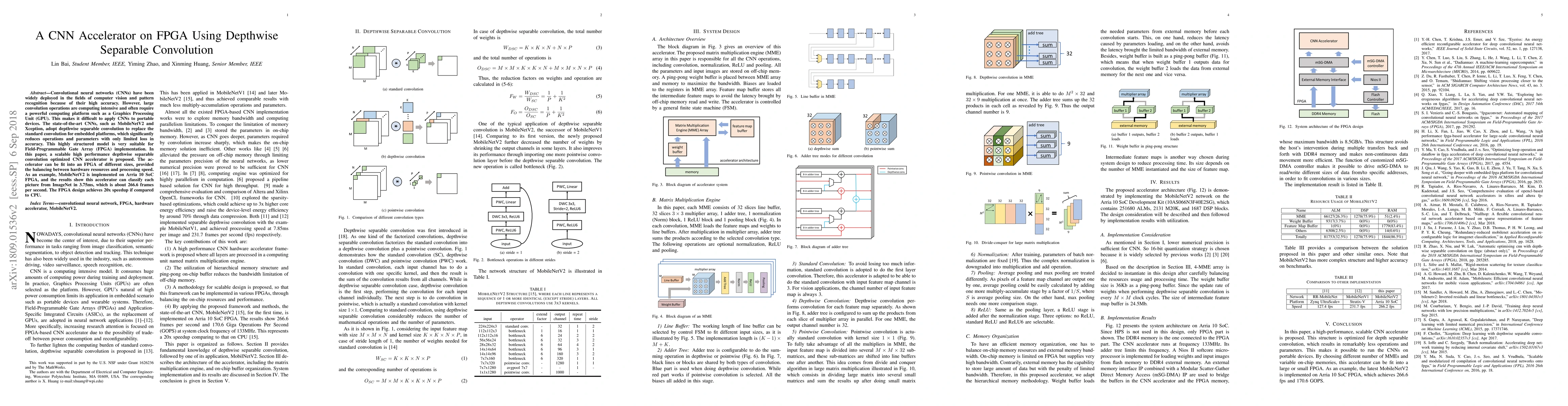 This paper presents a scalable CNN accelerator on FPGA using depthwise separable convolution to enhance the deployment of CNNs on portable devices. Implementing MobileNetV2 on an Arria 10 SoC FPGA, the proposed accelerator achieves a 266.6 fps classification speed, offering a 20x speedup over CPU and demonstrating suitability for FPGA implementation.