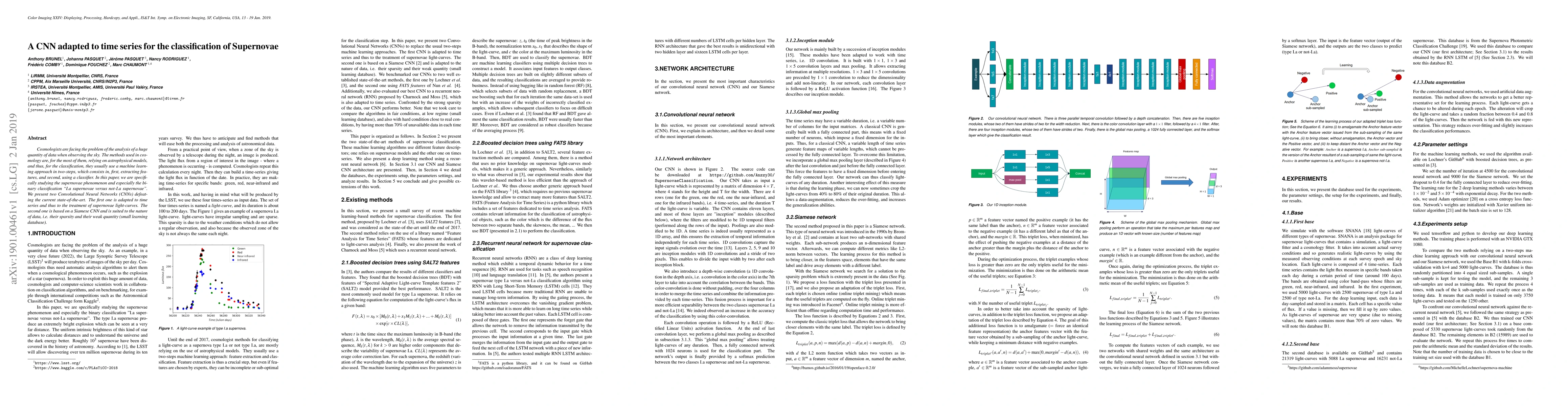 Cosmologists are facing the problem of the analysis of a huge quantity of data when observing the sky. The methods used in cosmology are, for the most of them, relying on astrophysical models, and thus, for the classification, they usually use a machine learning approach in two-steps, which consists in, first, extracting features, and second, using a classifier. In this paper, we are specifically studying the supernovae phenomenon and especially the binary classification "I.a supernovae versus not-I.a supernovae". We present two Convolutional Neural Networks (CNNs) defeating the current state-of-the-art. The first one is adapted to time series and thus to the treatment of supernovae light-curves. The second one is based on a Siamese CNN and is suited to the nature of data, i.e. their sparsity and their weak quantity (small learning database).