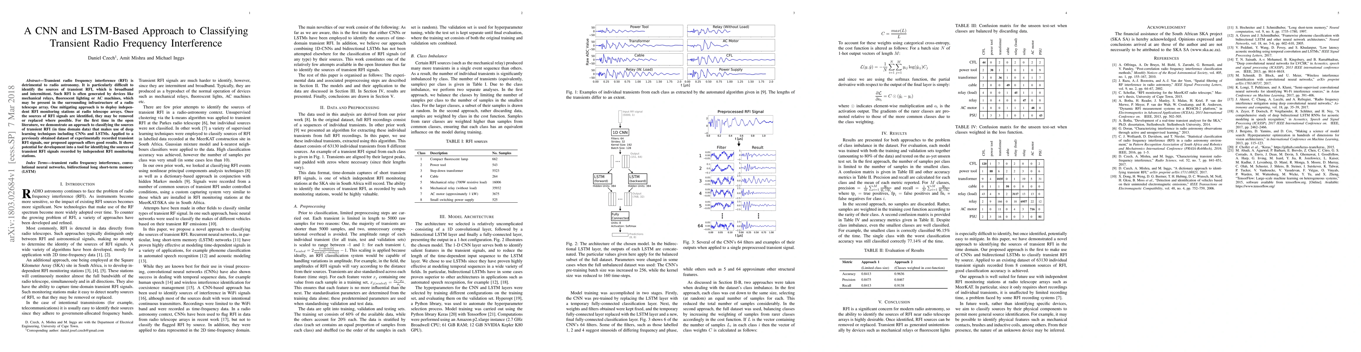 Transient radio frequency interference (RFI) is detrimental to radio astronomy. It is particularly difficult to identify the sources of transient RFI, which is broadband and intermittent. Such RFI is often generated by devices like mechanical relays, fluorescent lighting or AC machines, which may be present in the surrounding infrastructure of a radio telescope array. One mitigating approach is to deploy independent RFI monitoring stations at radio telescope arrays. Once the sources of RFI signals are identified, they may be removed or replaced where possible. For the first time in the open literature, we demonstrate an approach to classifying the sources of transient RFI (in time domain data) that makes use of deep learning techniques including CNNs and LSTMs. Applied to a previously obtained dataset of experimentally recorded transient RFI signals, our proposed approach offers good results. It shows potential for development into a tool for identifying the sources of transient RFI signals recorded by independent RFI monitoring stations.