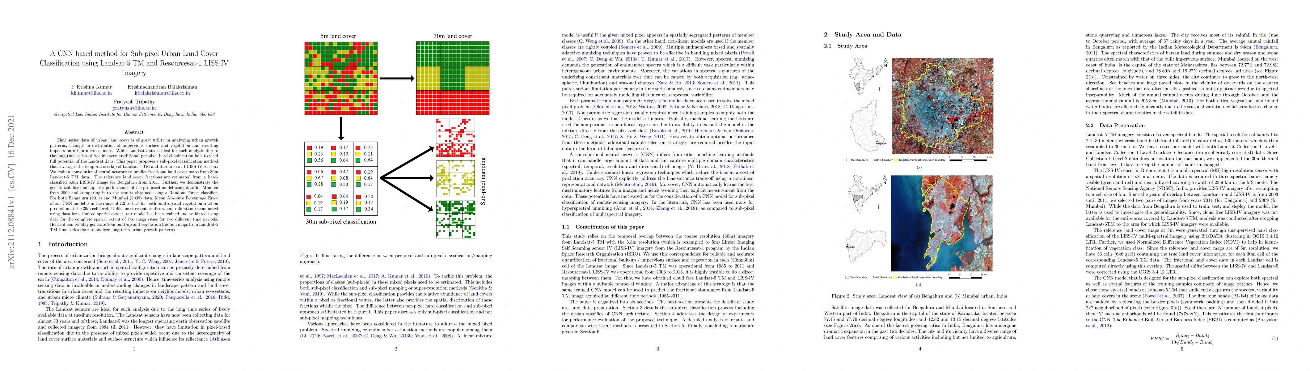 Time series data of urban land cover is of great utility in analyzing urban growth patterns, changes in distribution of impervious surface and vegetation and resulting impacts on urban micro climate. While Landsat data is ideal for such analysis due to the long time series of free imagery, traditional per-pixel hard classification fails to yield full potential of the Landsat data. This paper proposes a sub-pixel classification method that leverages the temporal overlap of Landsat-5 TM and Resourcesat-1 LISS-IV sensors. We train a convolutional neural network to predict fractional land cover maps from 30m Landsat-5 TM data. The reference land cover fractions are estimated from a hard-classified 5.8m LISS-IV image for Bengaluru from 2011. Further, we demonstrate the generalizability and superior performance of the proposed model using data for Mumbai from 2009 and comparing it to the results obtained using a Random Forest classifier. For both Bengaluru (2011) and Mumbai (2009) data, Mean Absolute Percentage Error of our CNN model is in the range of 7.2 to 11.3 for both built-up and vegetation fraction prediction at the 30m cell level. Unlike most recent studies where validation is conducted using data for a limited spatial extent, our model has been trained and validated using data for the complete spatial extent of two mega cities for two different time periods. Hence it can reliably generate 30m built-up and vegetation fraction maps from Landsat-5 TM time series data to analyze long term urban growth patterns.