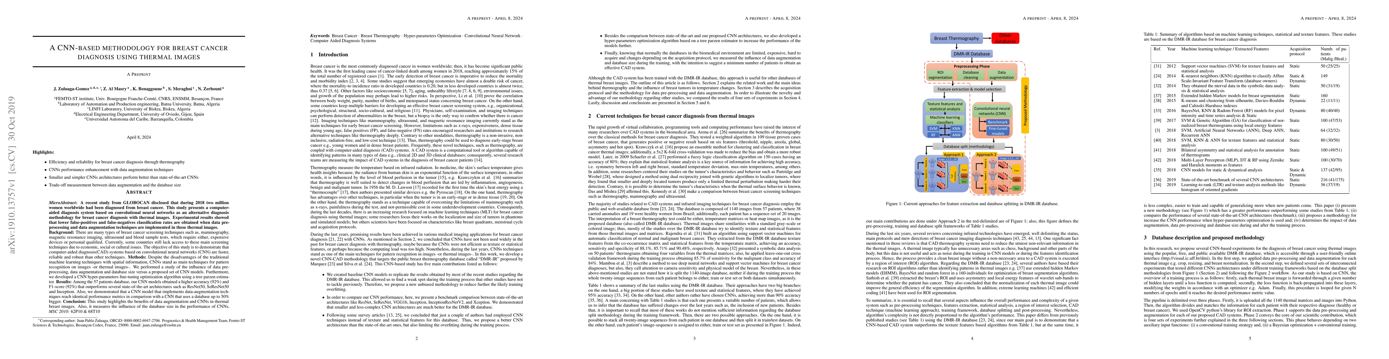This study explores a novel computer-aided diagnosis system for breast cancer diagnosis using thermal images and convolutional neural networks (CNN). The research demonstrates that CNN models, especially when enhanced with data pre-processing and augmentation techniques, achieve higher accuracy and F1-score compared to other state-of-the-art architectures, suggesting a potential alternative to traditional, resource-intensive screening methods.