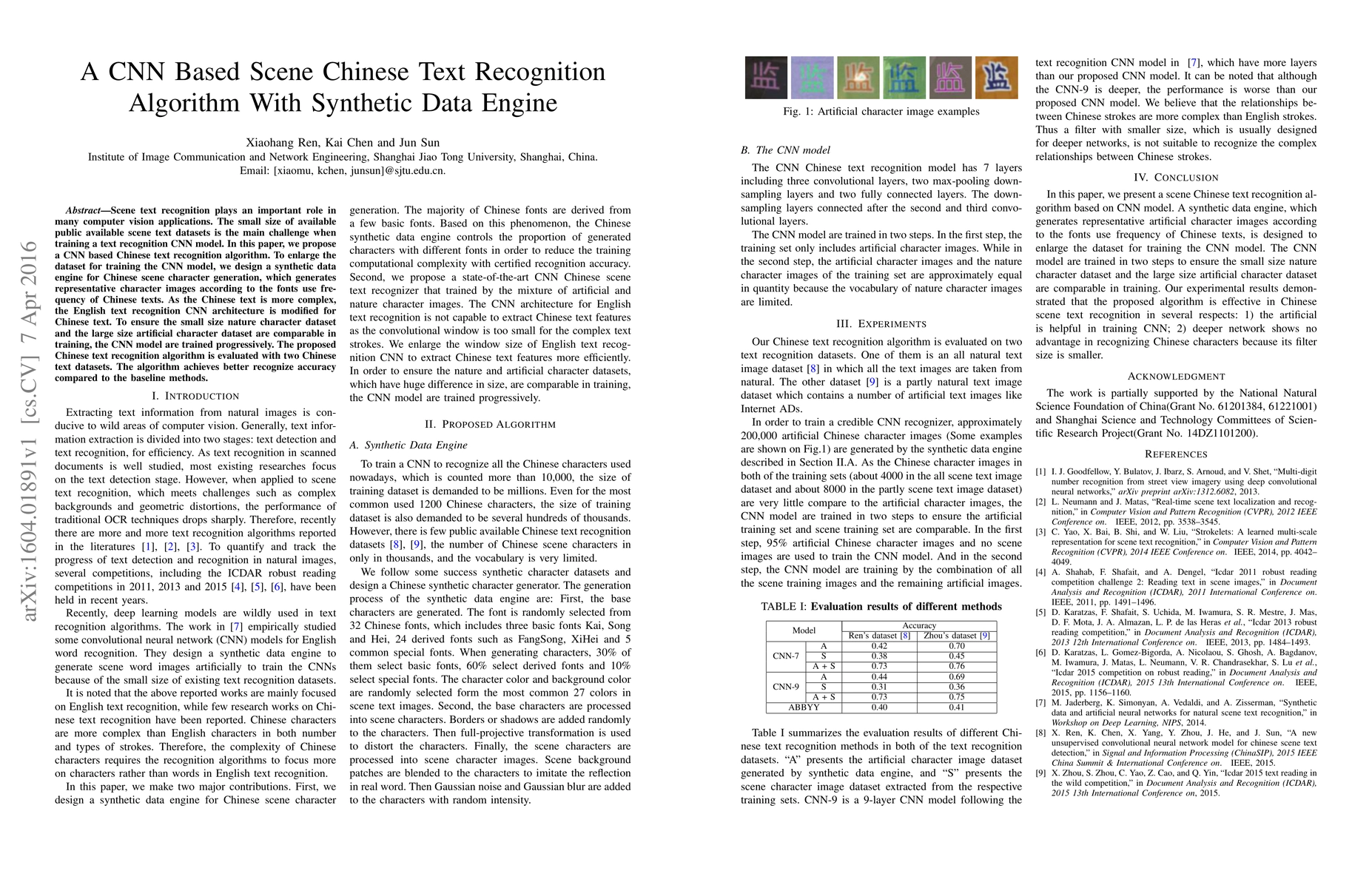 This paper proposes a CNN-based Chinese text recognition algorithm that addresses the challenge of small public datasets by using a synthetic data engine to generate representative Chinese scene characters. The modified CNN architecture is trained progressively to ensure comparability between the small natural and large synthetic datasets, achieving better recognition accuracy than baseline methods.