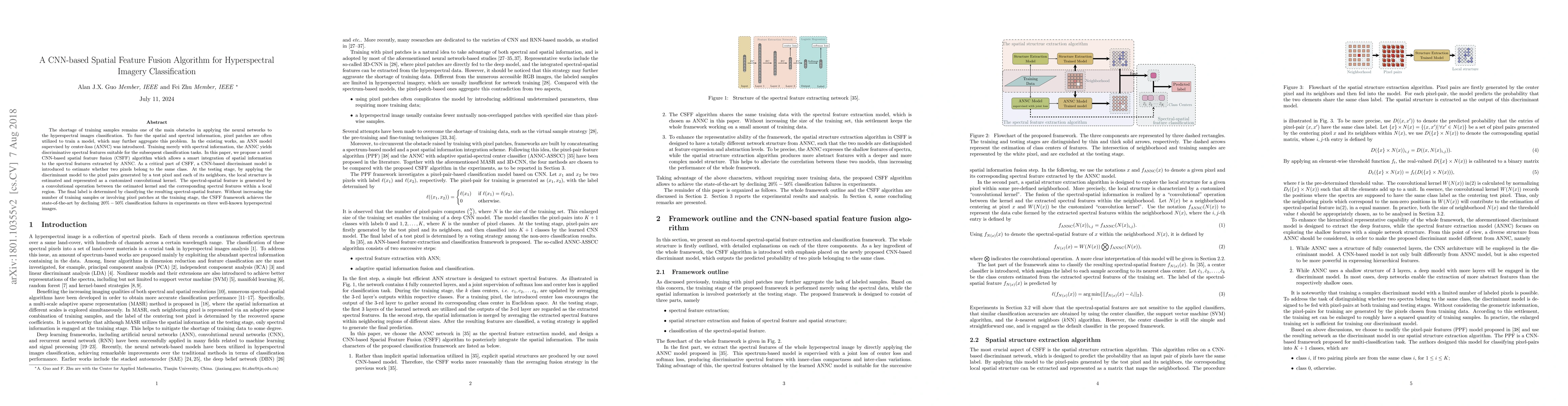 This paper proposes a CNN-based spatial feature fusion (CSFF) algorithm to enhance hyperspectral image classification by integrating spatial information with spectral features extracted by an ANNC model. The CSFF framework achieves state-of-the-art results by reducing classification failures by 20%-50% without increasing training samples or using pixel patches.