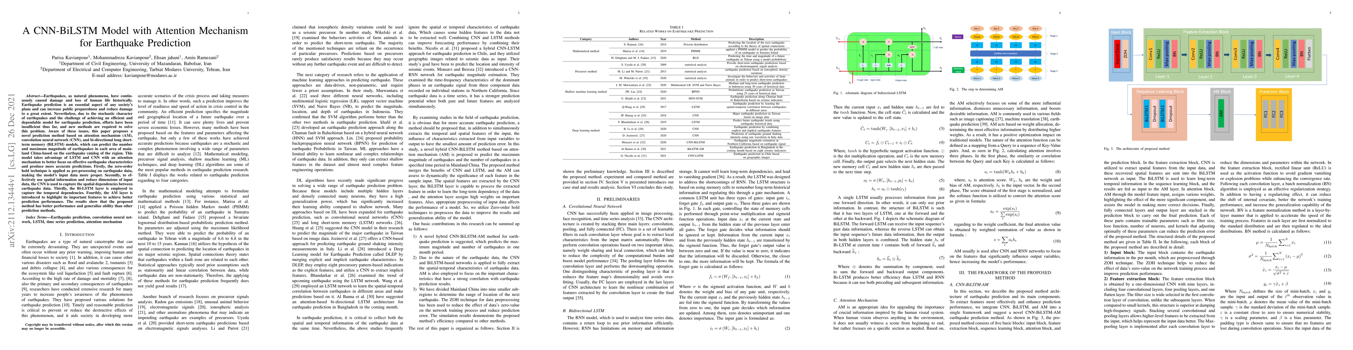 This paper proposes a CNN-BiLSTM model with an attention mechanism for earthquake prediction in mainland China, utilizing CNN for spatial feature extraction, BiLSTM for temporal dependencies, and an attention mechanism to enhance feature focus. The model demonstrates superior prediction accuracy and generalization compared to existing methods.
