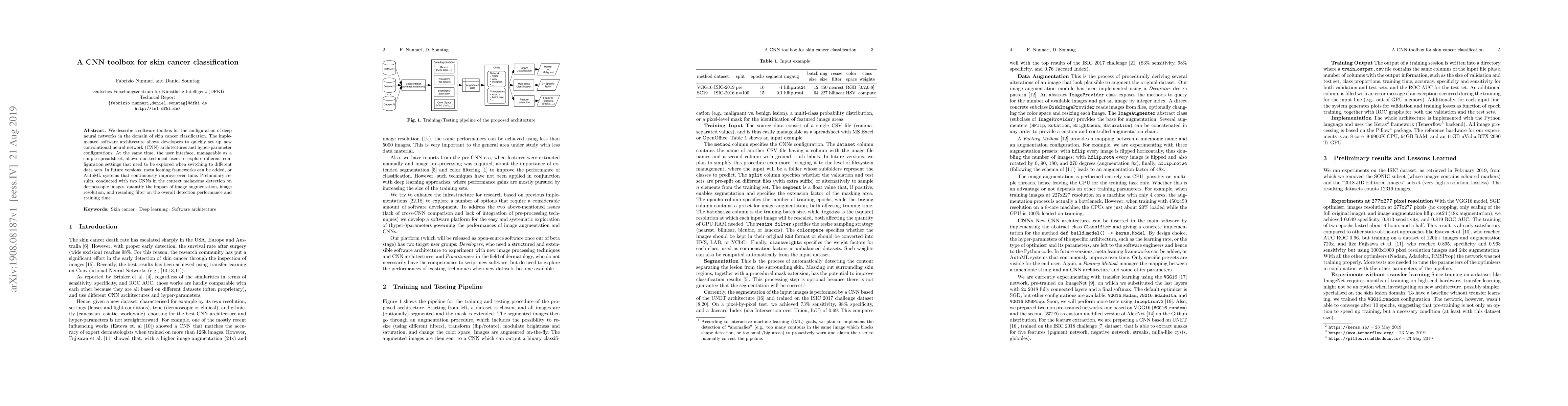 We describe a software toolbox for the configuration of deep neural networks in the domain of skin cancer classification. The implemented software architecture allows developers to quickly set up new convolutional neural network (CNN) architectures and hyper-parameter configurations. At the same time, the user interface, manageable as a simple spreadsheet, allows non-technical users to explore different configuration settings that need to be explored when switching to different data sets. In future versions, meta leaning frameworks can be added, or AutoML systems that continuously improve over time. Preliminary results, conducted with two CNNs in the context melanoma detection on dermoscopic images, quantify the impact of image augmentation, image resolution, and rescaling filter on the overall detection performance and training time.