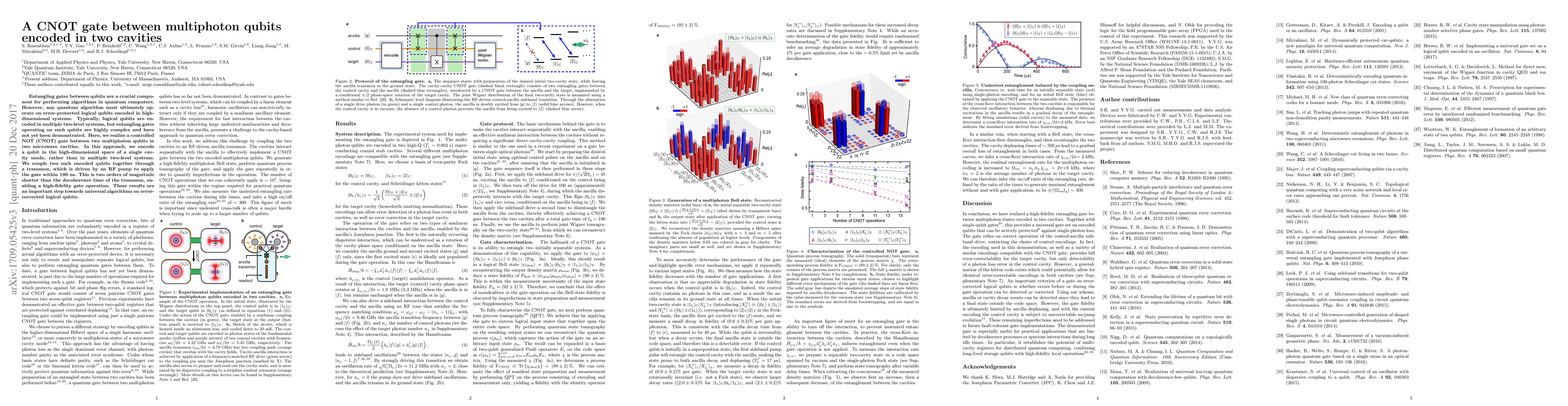 This paper demonstrates a controlled NOT (CNOT) gate between multiphoton qubits encoded in single microwave cavity modes, using a transmon driven by an RF pump to achieve high-fidelity gate operation within 190 ns, significantly shorter than the transmon's decoherence time. This approach marks a significant step towards universal quantum algorithms on error-protected logical qubits.