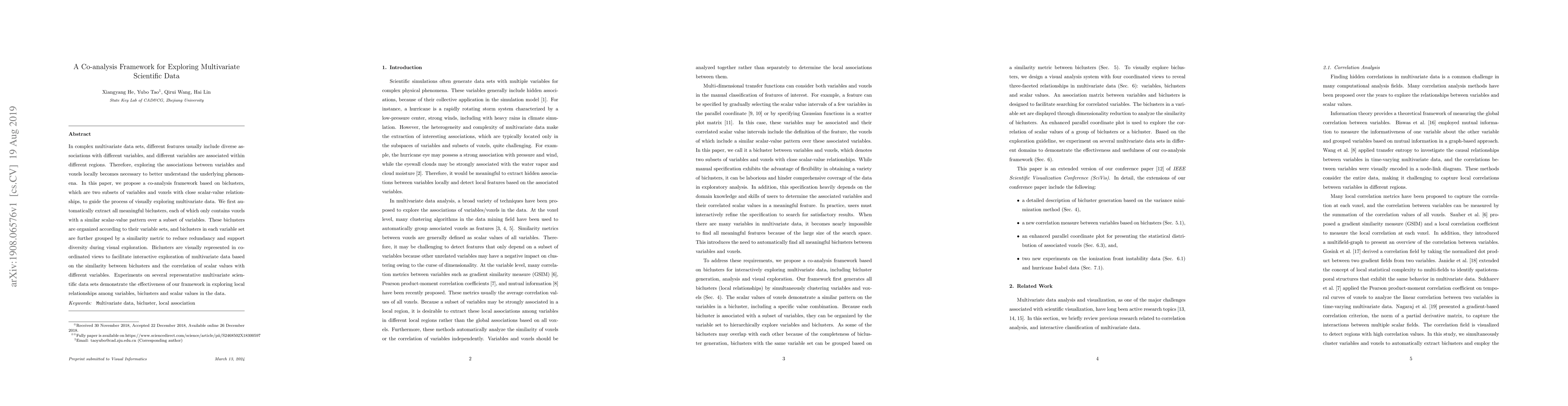 Researchers propose a co-analysis framework to explore complex multivariate data by identifying clusters of variables and voxels with similar scalar-value patterns. The framework facilitates interactive exploration of local relationships among variables, biclusters, and scalar values in the data.