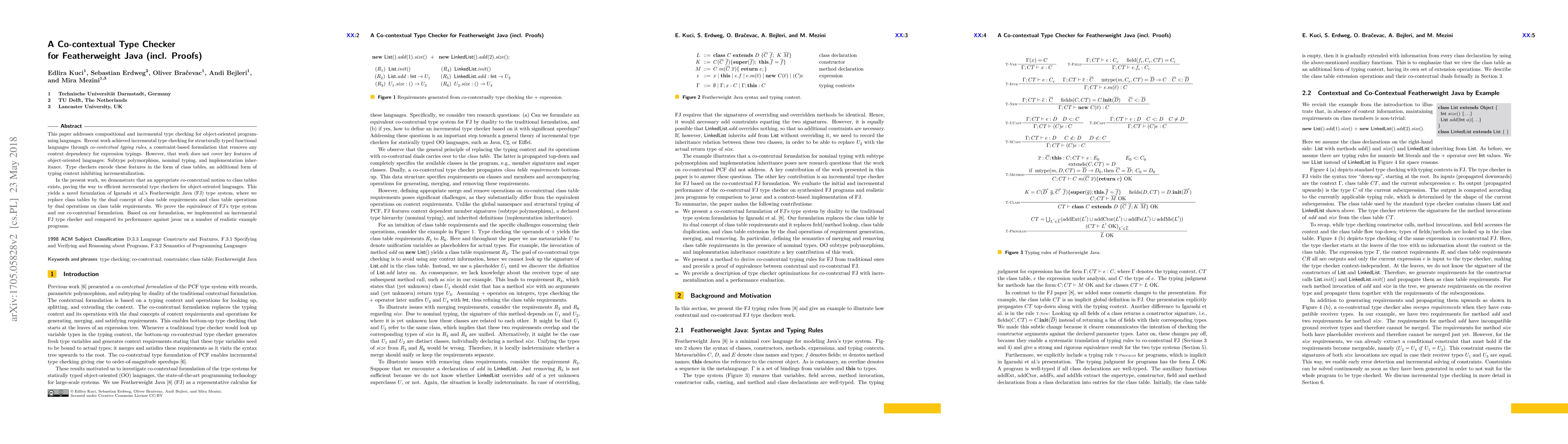 This paper introduces a co-contextual type checker for Featherweight Java that supports incremental type checking, addressing the limitations of previous work by incorporating object-oriented features like subtype polymorphism and inheritance. The authors demonstrate the equivalence of their new formulation with the original Featherweight Java type system and show improved performance in incremental type checking.