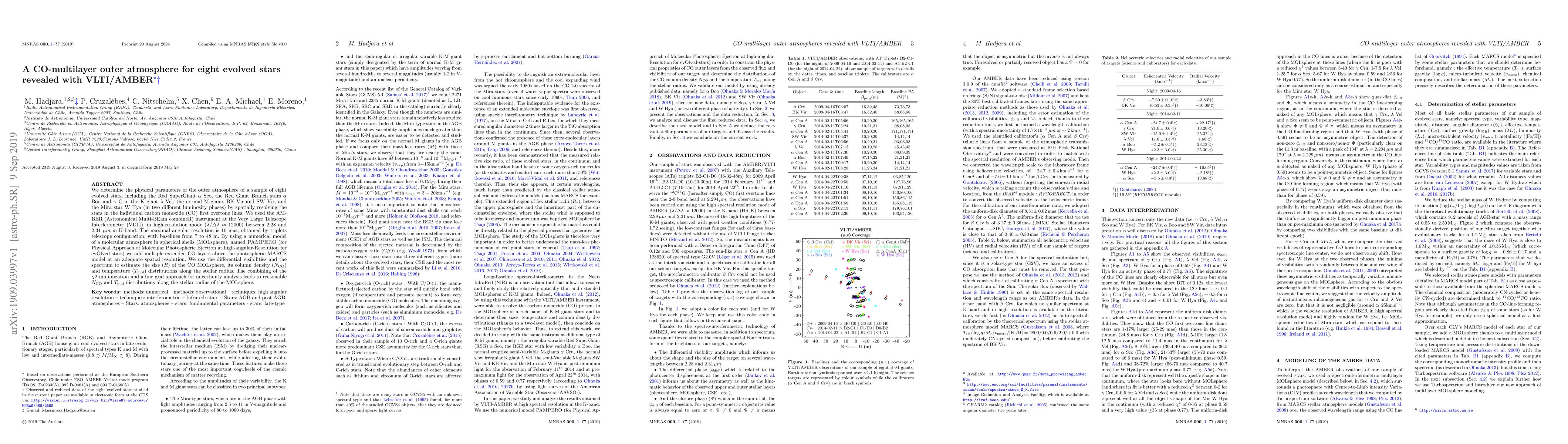 This study uses the VLTI/AMBER instrument to spatially resolve the CO outer atmospheres of eight evolved stars, revealing multiple CO-multilayer structures. The research estimates the size, temperature, and column density of these layers using a numerical model called PAMPERO, providing insights into the physical parameters of these stars' atmospheres.